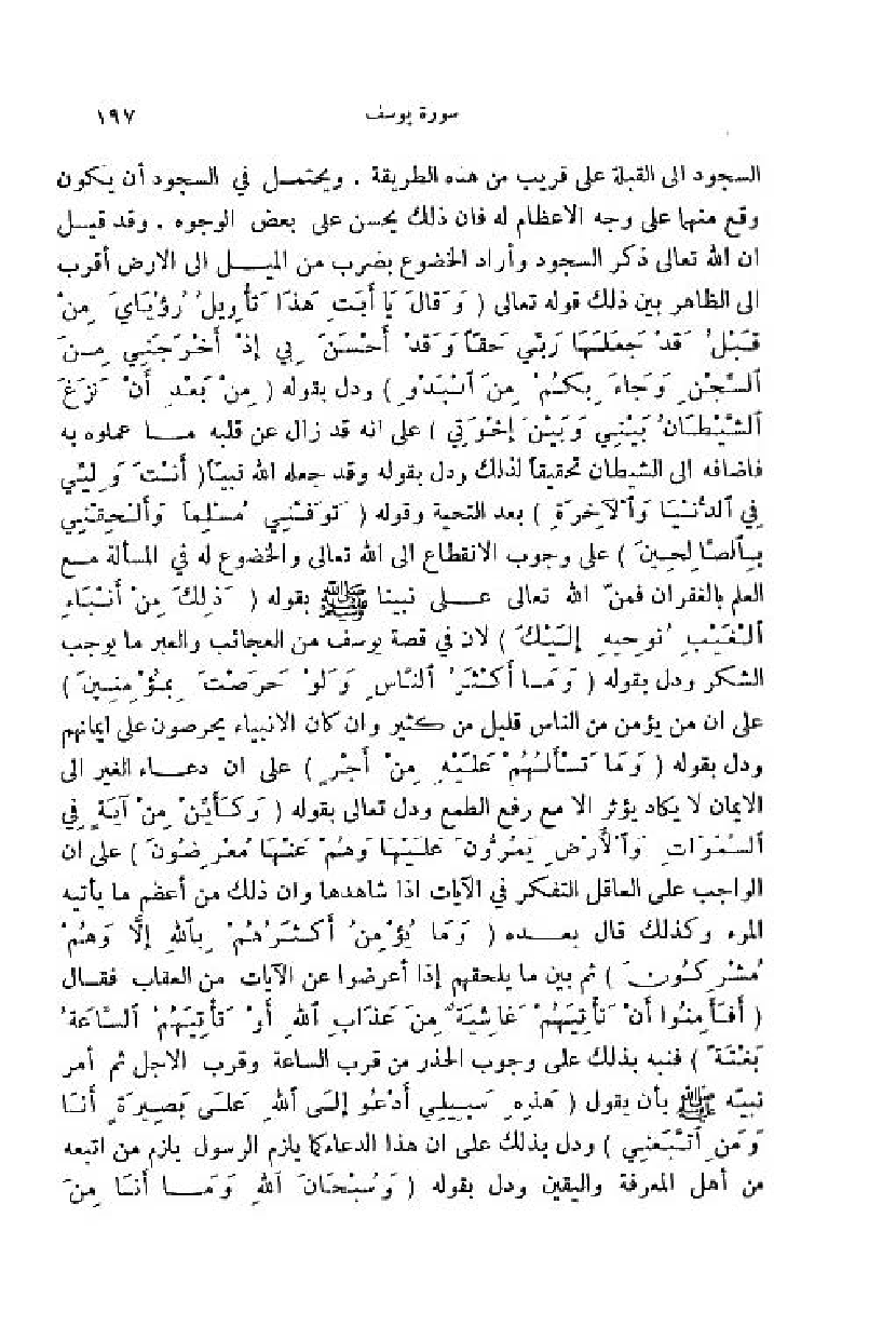 السجود الى القبلة على قريب من هذه الطريقة. ويحتمل في السجود أن يكون وقع منهما على وجه الاعظام له فان ذلك يحسن على بعض الوجوه. وقد قيل ان اللّه تعالى ذكر السجود وأراد الخضوع بضرب من الميل الى الارض أقرب الى الظاهر بين ذلك قوله تعالى (وَ قالَ يا أَبَتِ هذا تَأْوِيلُ رُءْيايَ مِنْ قَبْلُ قَدْ جَعَلَها رَبِّي حَقًّا وقَدْ أَحْسَنَ بِي إِذْ أَخْرَجَنِي مِنَ السِّجْنِ وجاءَ بِكُمْ مِنَ الْبَدْوِ) ودل بقوله (مِنْ بَعْدِ أَنْ نَزَغَ الشَّيْطانُ بَيْنِي وبَيْنَ إِخْوَتِي) على انه قد زال عن قلبه ما عملوه به فاضافه الى الشيطان تحقيقا لذلك ودل بقوله وقد جعله اللّه نبيّا (أَنْتَ وَلِيِّي فِي الدُّنْيا والْآخِرَةِ) بعد التحية وقوله (تَوَفَّنِي مُسْلِماً وأَلْحِقْنِي بِالصَّالِحِينَ) على وجوب الانقطاع الى اللّه تعالى والخضوع له في المسألة مع العلم بالغفران فمنّ اللّه تعالى على نبينا صلّى اللّه عليه وسلم بقوله (ذلِكَ مِنْ أَنْباءِ الْغَيْبِ نُوحِيهِ إِلَيْكَ) لان في قصة يوسف من العجائب والعبر ما يوجب الشكر ودل بقوله (وَ ما أَكْثَرُ النَّاسِ ولَوْ حَرَصْتَ بِمُؤْمِنِينَ) على ان من يؤمن من الناس قليل من كثير وان كان الانبياء يحرصون على ايمانهم ودل بقوله (وَ ما تَسْئَلُهُمْ عَلَيْهِ مِنْ أَجْرٍ) على ان دعاء الغير الى الايمان لا يكاد يؤثر الا مع رفع الطمع ودل تعالى بقوله (وَ كَأَيِّنْ مِنْ آيَةٍ فِي السَّماواتِ والْأَرْضِ يَمُرُّونَ عَلَيْها وهُمْ عَنْها مُعْرِضُونَ) على ان الواجب على العاقل التفكر في الآيات اذا شاهدها وان ذلك من أعظم ما يأتيه المرء وكذلك قال بعده (وَ ما يُؤْمِنُ أَكْثَرُهُمْ بِاللَّهِ إِلَّا وهُمْ مُشْرِكُونَ) ثمّ بين ما يلحقهم إذا أعرضوا عن الآيات من العقاب فقال (أَ فَأَمِنُوا أَنْ تَأْتِيَهُمْ غاشِيَةٌ مِنْ عَذابِ اللَّهِ أَوْ تَأْتِيَهُمُ السَّاعَةُ بَغْتَةً) فنبه بذلك على وجوب الحذر من قرب الساعة وقرب الاجل ثمّ أمر نبيّه صلّى اللّه عليه وسلم بأن يقول (هذِهِ سَبِيلِي أَدْعُوا إِلَى اللَّهِ عَلى بَصِيرَةٍ أَنَا ومَنِ اتَّبَعَنِي) ودل بذلك على ان هذا الدعاء كما يلزم الرسول يلزم من اتبعه من أهل المعرفة واليقين ودل بقوله (وَ سُبْحانَ اللَّهِ وما أَنَا مِنَ)