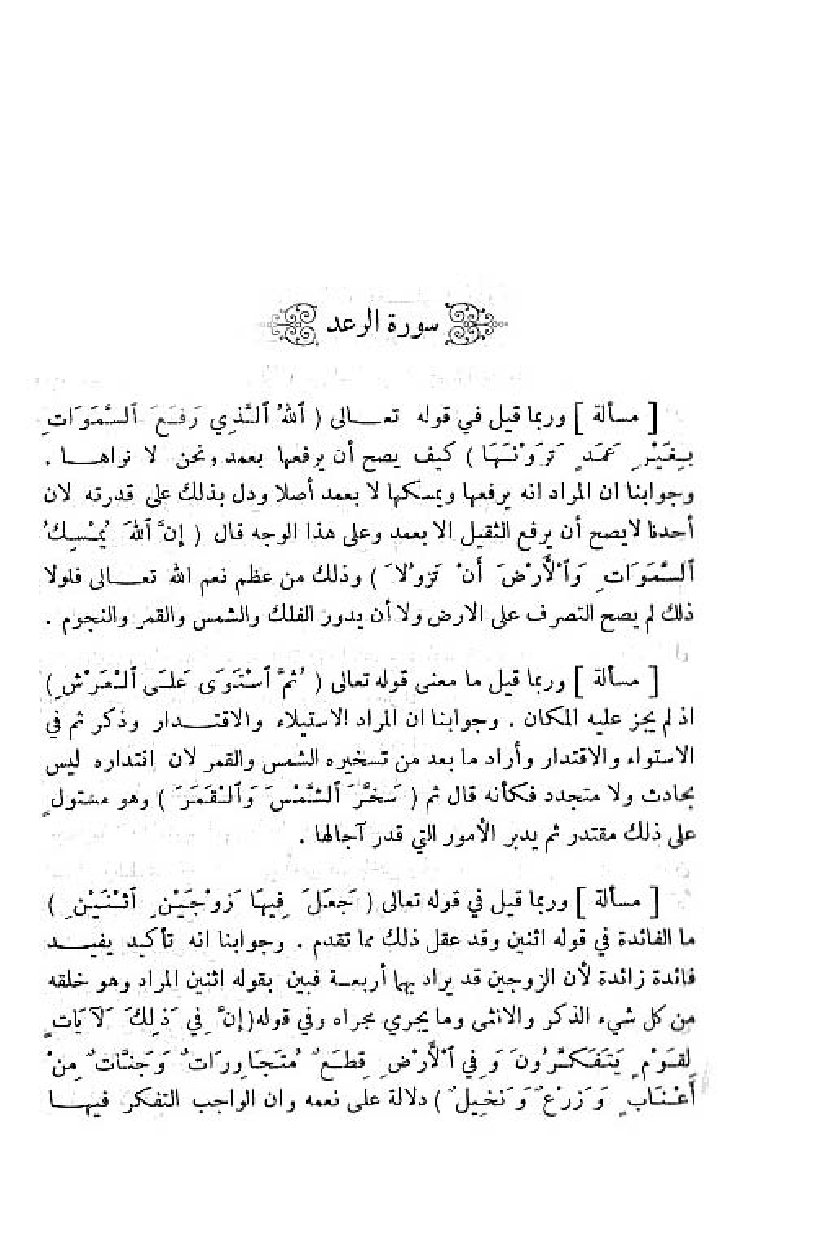 وربما قيل في قوله تعالى (جَعَلَ فِيها زَوْجَيْنِ اثْنَيْنِ) ما الفائدة في قوله اثنين وقد عقل ذلك مما تقدم. وجوابنا انه تأكيد يفيد فائدة زائدة لأن الزوجين قد يراد بهما أربعة فبين بقوله اثنين المراد وهو خلقه من كل شيء الذكر والانثى وما يجري مجراه وفي قوله (إِنَّ فِي ذلِكَ لَآياتٍ لِقَوْمٍ يَتَفَكَّرُونَ وفِي الْأَرْضِ قِطَعٌ مُتَجاوِراتٌ وجَنَّاتٌ مِنْ أَعْنابٍ وزَرْعٌ ونَخِيلٌ) دلالة على نعمه وان الواجب التفكر فيها