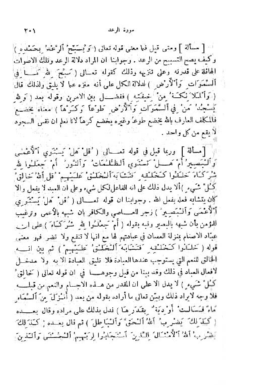 وربما قيل في قوله تعالى (قُلْ هَلْ يَسْتَوِي الْأَعْمى والْبَصِيرُ أَمْ هَلْ تَسْتَوِي الظُّلُماتُ والنُّورُ أَمْ جَعَلُوا لِلَّهِ شُرَكاءَ خَلَقُوا كَخَلْقِهِ فَتَشابَهَ الْخَلْقُ عَلَيْهِمْ قُلِ اللَّهُ خالِقُ كُلِّ شَيْءٍ) أ لا يدل ذلك على انه الفاعل لكل شيء وعلى ان العبد لا يفعل والا كان يتشابه فعله بفعل اللّه. وجوابنا ان قوله تعالى (قُلْ هَلْ يَسْتَوِي الْأَعْمى والْبَصِيرُ) زجر للعاصي والكافر بان شبهه بالأعمى وترغيب للمؤمن بأن شبهه بالبصير ونبه بقوله (أَمْ جَعَلُوا لِلَّهِ شُرَكاءَ) على ان عبّاد الاصنام بمنزلة العميان في عبادتهم لها مع انها لا تنفع ولا تضر فهو معنى قوله (خَلَقُوا كَخَلْقِهِ فَتَشابَهَ الْخَلْقُ عَلَيْهِمْ) ثمّ بين انه الخالق للنعم التي يستوجب عندها العبادة فلا تليق العبادة الا به ولا مدخل لافعال العباد في ذلك وقد بينا من قيل وجوها في ان قوله تعالى (خالِقُ كُلِّ شَيْءٍ) لا يدل الا على ان المقدر من هذه الاجسام والنعم من قبله فلا وجه لا يراد ذلك وبيّن تعالى ما أراده بقوله من بعد (أَنْزَلَ مِنَ السَّماءِ ماءً فَسالَتْ أَوْدِيَةٌ بِقَدَرِها) فدل بذلك على مراده وقال بعده (كَذلِكَ يَضْرِبُ اللَّهُ الْحَقَّ والْباطِلَ) ثمّ قال بعده (كَذلِكَ يَضْرِبُ اللَّهُ الْأَمْثالَ لِلَّذِينَ اسْتَجابُوا لِرَبِّهِمُ الْحُسْنى والَّذِينَ