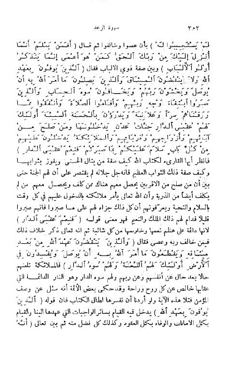 لَمْ يَسْتَجِيبُوا لَهُ) بأن عصوا وخالفوا ثمّ قال (أَ فَمَنْ يَعْلَمُ أَنَّما أُنْزِلَ إِلَيْكَ مِنْ رَبِّكَ الْحَقُّ كَمَنْ هُوَ أَعْمى إِنَّما يَتَذَكَّرُ أُولُوا الْأَلْبابِ) وبين صفة ذوي الالباب فقال (الَّذِينَ يُوفُونَ بِعَهْدِ اللَّهِ ولا يَنْقُضُونَ الْمِيثاقَ والَّذِينَ يَصِلُونَ ما أَمَرَ اللَّهُ بِهِ أَنْ يُوصَلَ ويَخْشَوْنَ رَبَّهُمْ ويَخافُونَ سُوءَ الْحِسابِ والَّذِينَ صَبَرُوا ابْتِغاءَ وَجْهِ رَبِّهِمْ وأَقامُوا الصَّلاةَ وأَنْفَقُوا مِمَّا رَزَقْناهُمْ سِرًّا وعَلانِيَةً ويَدْرَؤُنَ بِالْحَسَنَةِ السَّيِّئَةَ أُولئِكَ لَهُمْ عُقْبَى الدَّارِ جَنَّاتُ عَدْنٍ يَدْخُلُونَها ومَنْ صَلَحَ مِنْ آبائِهِمْ وأَزْواجِهِمْ وذُرِّيَّاتِهِمْ والْمَلائِكَةُ يَدْخُلُونَ عَلَيْهِمْ مِنْ كُلِّ بابٍ سَلامٌ عَلَيْكُمْ بِما صَبَرْتُمْ فَنِعْمَ عُقْبَى الدَّارِ) فانظر أيها القارئ لكتاب اللّه كيف صفة من ينال الحسنى ويفوز بثوابها وكيف صفة ذلك الثواب العظيم فانه جل جلاله لم يقتصر على أن لهم الجنة حتى بين أن من صلح من الاقربين يحصل معهم هتاك ممن كلف ويحصل معهم من لم يكلف أيضا من الذرية وأن اللّه تعالى يأمر ملائكته بالدخول عليهم في كل وقت بالسلام والتحية ويعرّفونهم أن كل ذلك جزاء لهم على ما صبروا فانهم صبروا قليلا فدام لهم ذلك الملك والنعيم فهو معنى قوله (فَنِعْمَ عُقْبَى الدَّارِ) لانها دائمة على عظم نعمها وخلوصها من كل شائبة ثمّ انه تعالى ذكر خلاف ذلك فيمن خالف ربه وعصى فقال (وَ الَّذِينَ يَنْقُضُونَ عَهْدَ اللَّهِ مِنْ بَعْدِ مِيثاقِهِ ويَقْطَعُونَ ما أَمَرَ اللَّهُ بِهِ أَنْ يُوصَلَ ويُفْسِدُونَ فِي الْأَرْضِ أُولئِكَ لَهُمُ اللَّعْنَةُ ولَهُمْ سُوءُ الدَّارِ) فالملائكة تلعنهم حالا بعد حال عن أنفسهم وعن ربهم ولهم سوء الدار وهو النار الدائمة التي عقابها خالص عن كل روح وراحة وقد حكى بعض الأئمة أنه سئل عن وصف المؤمن فتلا هذه الآية ولو أردنا أن نفسرها لطال الكتاب فان قوله (الَّذِينَ يُوفُونَ بِعَهْدِ اللَّهِ) يدخل فيه القيام بسائر الواجبات التي عهدها الينا والقيام بكل الامانات والوفاء بكل العقود وكذلك كل فضل منه ثمّ بين تعالى (أنه)