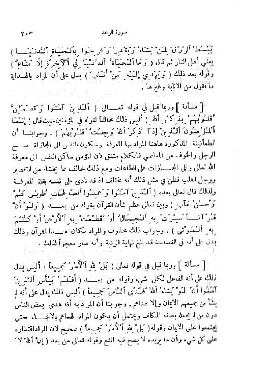 وربما قيل في قوله تعالى (بَلْ لِلَّهِ الْأَمْرُ جَمِيعاً) أ ليس يدل ذلك على أنه الفاعل لكل شيء وقوله من بعد (أَ فَلَمْ يَيْأَسِ الَّذِينَ آمَنُوا أَنْ لَوْ يَشاءُ اللَّهُ لَهَدَى النَّاسَ جَمِيعاً) أ ليس ذلك يدل على أنه لم يشأ من جميعهم الايمان وإلا لهداهم. وجوابنا أن المراد به أنه هدى بعض الناس دون من لم يجعله بصفة المكلف ويحتمل أن يكون المراد لهداهم بالالجاء حتى يجتمعوا على الايمان وقوله (بَلْ لِلَّهِ الْأَمْرُ جَمِيعاً) صحيح لان المراد اقتداره على كل شيء وأن ما يريده لا يصح فيه المنع وقوله تعالى من بعد (إِنَّ اللَّهَ لا