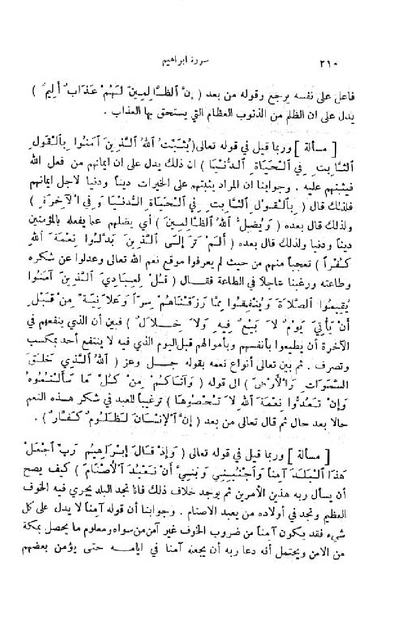 وربما قيل في قوله تعالى (يُثَبِّتُ اللَّهُ الَّذِينَ آمَنُوا بِالْقَوْلِ الثَّابِتِ فِي الْحَياةِ الدُّنْيا) ان ذلك يدل على ان ايمانهم من فعل اللّه فيثبتهم عليه. وجوابنا ان المراد يثبتهم على الخيرات دينا ودنيا لاجل ايمانهم فلذلك قال (بِالْقَوْلِ الثَّابِتِ فِي الْحَياةِ الدُّنْيا وفِي الْآخِرَةِ) ولذلك قال بعده (وَ يُضِلُّ اللَّهُ الظَّالِمِينَ) أي يضلهم عما يفعله بالمؤمنين دينا ودنيا ولذلك قال بعده (أَ لَمْ تَرَ إِلَى الَّذِينَ بَدَّلُوا نِعْمَتَ اللَّهِ كُفْراً) تعجبا منهم من حيث لم يعرفوا موقع نعم اللّه تعالى وعدلوا عن شكره وطاعته ورغبنا عاجلا في الطاعة فقال (قُلْ لِعِبادِيَ الَّذِينَ آمَنُوا يُقِيمُوا الصَّلاةَ ويُنْفِقُوا مِمَّا رَزَقْناهُمْ سِرًّا وعَلانِيَةً مِنْ قَبْلِ أَنْ يَأْتِيَ يَوْمٌ لا بَيْعٌ فِيهِ ولا خِلالٌ) فبين أن الذي ينفعهم في الآخرة أن يطيعوا بأنفسهم وبأموالهم قبل اليوم الذي فيه لا ينتفع أحد بمكسب وتصرف. ثمّ بين تعالى أنواع نعمه بقوله جل وعز (اللَّهُ الَّذِي خَلَقَ السَّماواتِ والْأَرْضَ) الى قوله (وَ آتاكُمْ مِنْ كُلِّ ما سَأَلْتُمُوهُ وإِنْ تَعُدُّوا نِعْمَتَ اللَّهِ لا تُحْصُوها) ترغيبا للعبد في شكر هذه النعم حالا بعد حال ثمّ قال تعالى من بعد (إِنَّ الْإِنْسانَ لَظَلُومٌ كَفَّارٌ).