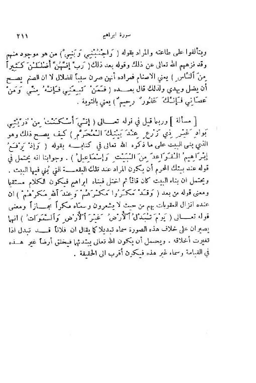 ويحتمل ان بناء البيت كان قائما ثمّ اختل فبناه ابراهيم فيكون الكلام مستقيما ومعنى قوله من بعد (وَ قَدْ مَكَرُوا مَكْرَهُمْ وعِنْدَ اللَّهِ مَكْرُهُمْ) ان عنده انزال العقوبات بهم من حيث لا يشعرون وسمّاه مكرا مجازا ومعنى قوله تعالى (يَوْمَ تُبَدَّلُ الْأَرْضُ غَيْرَ الْأَرْضِ والسَّماواتُ) انهما يصيران على خلاف هذه الصورة سماه تبديلا كما يقال ان فلانا قد تبدل اذا تغيرت أخلاقه. ويحتمل أن يكون اللّه تعالى يبتدئهما فيخلق أرضا غير هذه في القيامة وسماء غير هذه فيكون أقرب الى الحقيقة.