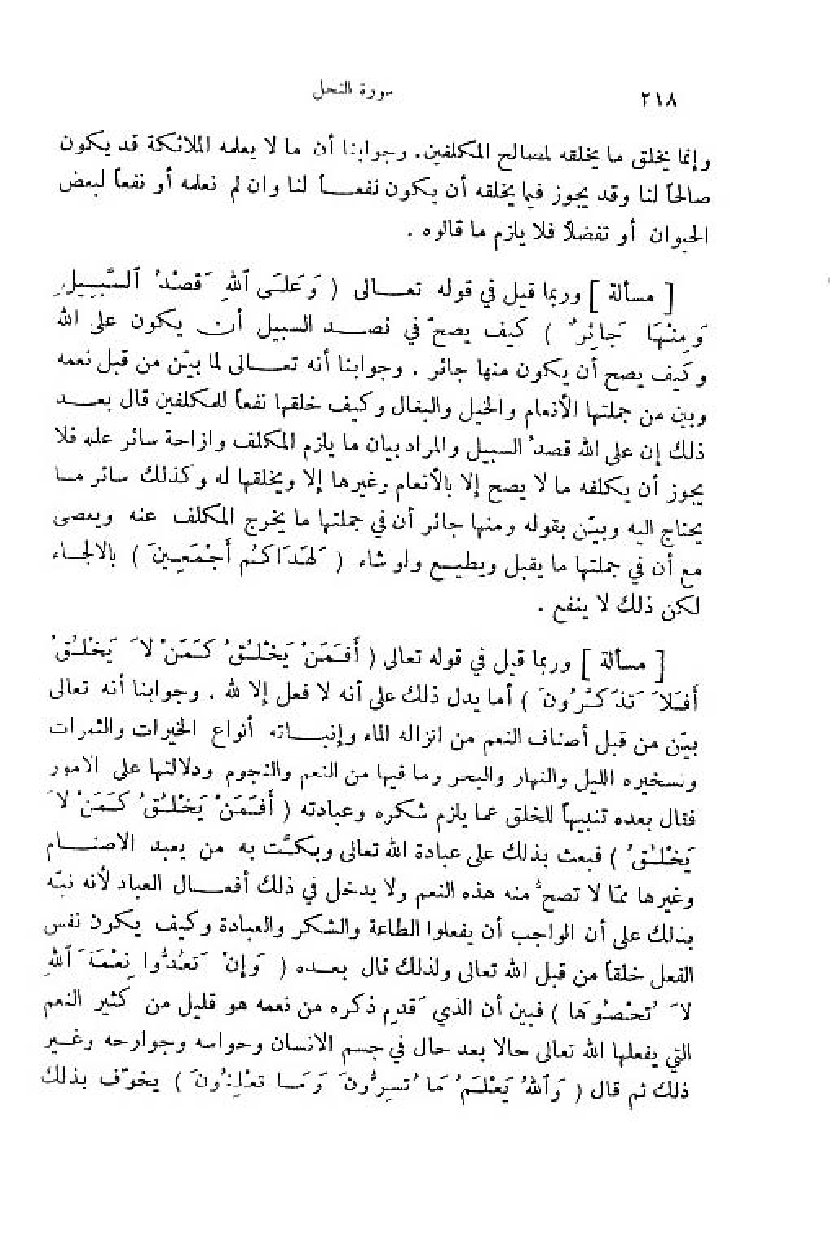 وربما قيل في قوله تعالى (وَ عَلَى اللَّهِ قَصْدُ السَّبِيلِ ومِنْها جائِرٌ) كيف يصحّ في قصد السبيل أن يكون على اللّه وكيف يصح أن يكون منها جائر. وجوابنا أنه تعالى لما بيّن من قبل نعمه وبين من جملتها الأنعام والخيل والبغال وكيف خلقها نفعا للمكلفين قال بعد ذلك إن على اللّه قصد السبيل والمراد بيان ما يلزم المكلف وازاحة سائر علله فلا يجوز أن يكلفه ما لا يصح إلا بالأنعام وغيرها إلا ويخلقها له وكذلك سائر ما يحتاج اليه وبيّن بقوله ومنها جائز أن في جملتها ما يخرج المكلف عنه ويعصى مع أن في جملتها ما يقبل ويطيع ولو شاء (لَهَداكُمْ أَجْمَعِينَ) بالالجاء لكن ذلك لا ينفع.