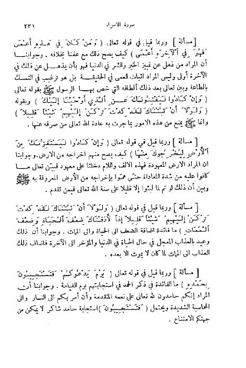 وربما قيل في قوله تعالى (وَ مَنْ كانَ فِي هذِهِ أَعْمى فَهُوَ فِي الْآخِرَةِ أَعْمى) كيف يصح ذلك مع علمنا بخلافه. وجوابنا أن المراد من ذهل عن تمييز الخير والشر في الدنيا فهو بأن يذهل عن ذلك في الآخرة أولى وليس المراد اثبات العمى في الحقيقة بل هو ترغيب في التمسك بالطاعة وبين تعالى بعد ذلك ألطافه التي خص بها الرسول صلّى اللّه عليه وسلم بقوله تعالى (وَ إِنْ كادُوا لَيَفْتِنُونَكَ عَنِ الَّذِي أَوْحَيْنا إِلَيْكَ) وبقوله (وَ لَوْ لا أَنْ ثَبَّتْناكَ لَقَدْ كِدْتَ تَرْكَنُ إِلَيْهِمْ شَيْئاً قَلِيلًا) وانما صلّى اللّه عليه وسلم يمنع من هذه الامور بما جرت به عادة اللّه تعالى من صرفه عنها.