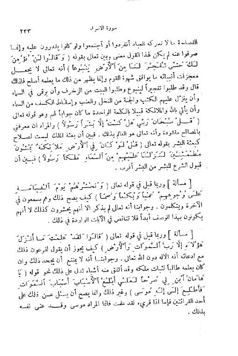 الفصاحة ما لا تدركه العباد انفردوا أو اجتمعوا ولو كانوا يقدرون عليه وإنما صرفوا عنه لم يكن لهذا القول معنى وبين تعالى بقوله (وَ قالُوا لَنْ نُؤْمِنَ لَكَ حَتَّى تَفْجُرَ لَنا مِنَ الْأَرْضِ يَنْبُوعاً) أنه تعالى لا يجعل معجزات أنبيائه ما يوافق شهوة القوم وإنما يظهر من ذلك ما يعلمه أصلح فلذلك قال وقد طلبوا تفجيرا لينبوع وطلبوا البيت من الزخرف وأن يرقى في السماء وأن ينزّل عليهم الكتب والجنة من النخل والعنب وإسقاط الكسف من السماء وأن يأتي باللّه والملائكة قبيلا بالكلمة الواحدة ما كان جوابا لهم وهو قوله تعالى (قُلْ سُبْحانَ رَبِّي هَلْ كُنْتُ إِلَّا بَشَراً رَسُولًا) والمراد ان معرفتي بالمصالح مفقودة وأنه تعالى هو العالم بذلك. فبين أن بعثة الملك ليست لصلاح كبعثة البشر بقوله تعالى (قُلْ لَوْ كانَ فِي الْأَرْضِ مَلائِكَةٌ يَمْشُونَ مُطْمَئِنِّينَ لَنَزَّلْنا عَلَيْهِمْ مِنَ السَّماءِ مَلَكاً رَسُولًا) فبين أن قبول الشرع للبشر من البشر أقرب.