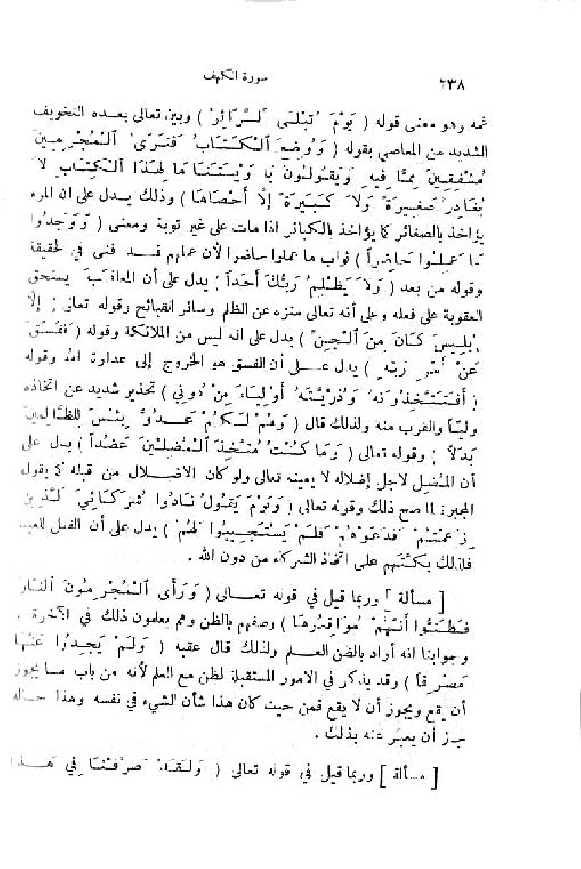 غمه وهو معنى قوله (يَوْمَ تُبْلَى السَّرائِرُ) وبين تعالى بعده التخويف الشديد من المعاصي بقوله (وَ وُضِعَ الْكِتابُ فَتَرَى الْمُجْرِمِينَ مُشْفِقِينَ مِمَّا فِيهِ ويَقُولُونَ يا وَيْلَتَنا ما لِهذَا الْكِتابِ لا يُغادِرُ صَغِيرَةً ولا كَبِيرَةً إِلَّا أَحْصاها) وذلك يدل على ان المرء يؤاخذ بالصغائر كما يؤاخذ بالكبائر اذا مات على غير توبة ومعنى (وَ وَجَدُوا ما عَمِلُوا حاضِراً) ثواب ما عملوا حاضرا لأن عملهم قد فنى في الحقيقة وقوله من بعد (وَ لا يَظْلِمُ رَبُّكَ أَحَداً) يدل على أن المعاقب يستحق العقوبة على فعله وعلى أنه تعالى منزه عن الظلم وسائر القبائح وقوله تعالى (إِلَّا إِبْلِيسَ كانَ مِنَ الْجِنِّ) يدل على انه ليس من الملائكة وقوله (فَفَسَقَ عَنْ أَمْرِ رَبِّهِ) يدل على أن الفسق هو الخروج إلى عداوة اللّه وقوله (أَ فَتَتَّخِذُونَهُ وذُرِّيَّتَهُ أَوْلِياءَ مِنْ دُونِي) تحذير شديد عن اتخاذه وليّا والقرب منه ولذلك قال (وَ هُمْ لَكُمْ عَدُوٌّ بِئْسَ لِلظَّالِمِينَ بَدَلًا) وقوله تعالى (وَ ما كُنْتُ مُتَّخِذَ الْمُضِلِّينَ عَضُداً) يدل على أن المضل لاجل إضلاله لا يعينه تعالى ولو كان الاضلال من قبله كما يقول المجبرة لما صح ذلك وقوله تعالى (وَ يَوْمَ يَقُولُ نادُوا شُرَكائِيَ الَّذِينَ زَعَمْتُمْ فَدَعَوْهُمْ فَلَمْ يَسْتَجِيبُوا لَهُمْ) يدل على أن الفعل للعبد فلذلك بكّتهم على اتخاذ الشركاء من دون اللّه.