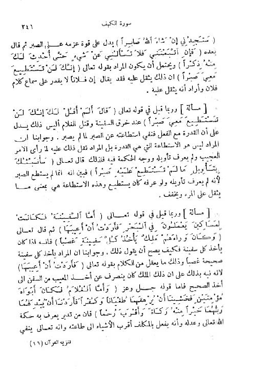وربما قيل في قوله تعالى (أَمَّا السَّفِينَةُ فَكانَتْ لِمَساكِينَ يَعْمَلُونَ فِي الْبَحْرِ فَأَرَدْتُ أَنْ أَعِيبَها) ثمّ قال تعالى (وَ كانَ وَراءَهُمْ مَلِكٌ يَأْخُذُ كُلَّ سَفِينَةٍ غَصْباً) فانه اذا كان يأخذ كل سفينة فكيف يصح أن يقول ذلك. وجوابنا ان المراد يأخذ كل سفينة صحيحة غصبا وذلك ما يعقل من الكلام بقوله تعالى (فَأَرَدْتُ أَنْ أَعِيبَها) لانه نبه بذلك على ان ذلك الملك كان ينصرف عن أخذ المعيب من السفن الى أخذ الصحيح فاما قوله جل وعز (وَ أَمَّا الْغُلامُ فَكانَ أَبَواهُ مُؤْمِنَيْنِ فَخَشِينا أَنْ يُرْهِقَهُما طُغْياناً وكُفْراً فَأَرَدْنا أَنْ يُبْدِلَهُما رَبُّهُما خَيْراً مِنْهُ زَكاةً وأَقْرَبَ رُحْماً) فان من تدبر يعرف به حكمة اللّه تعالى وعدله وأنه يفعل بالمكلف أقرب الأشياء الى طاعته وانه تعالى ينفي تنزيه القرآن (16)