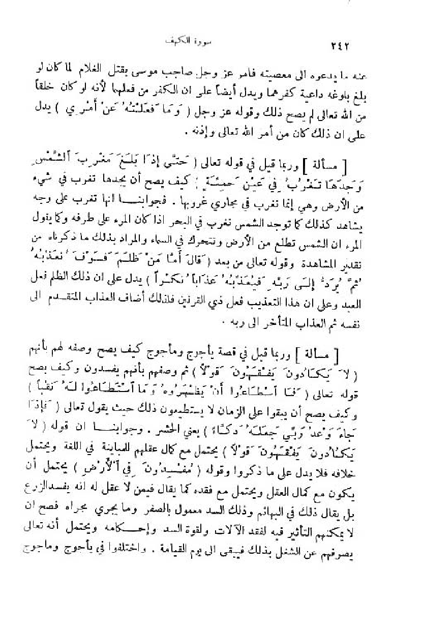 وربما قيل في قوله تعالى (حَتَّى إِذا بَلَغَ مَغْرِبَ الشَّمْسِ وَجَدَها تَغْرُبُ فِي عَيْنٍ حَمِئَةٍ) كيف يصح أن يجدها تغرب في شيء من الأرض وهي إنما تغرب في مجاري غروبها. فجوابنا انها تغرب على وجه يشاهد كذلك كما توجد الشمس تغرب في البحر اذا كان المرء على طرفه وكما يقول المرء ان الشمس تطلع من الأرض وتتحرك في السماء والمراد بذلك ما ذكرناه من تقدير المشاهدة وقوله تعالى من بعد (قالَ أَمَّا مَنْ ظَلَمَ فَسَوْفَ نُعَذِّبُهُ ثُمَّ يُرَدُّ إِلى رَبِّهِ فَيُعَذِّبُهُ عَذاباً نُكْراً) يدل على ان ذلك الظلم فعل العبد وعلى ان هذا التعذيب فعل ذي القرنين فلذلك أضاف العذاب المتقدم الى نفسه ثمّ العذاب المتأخر الى ربه.