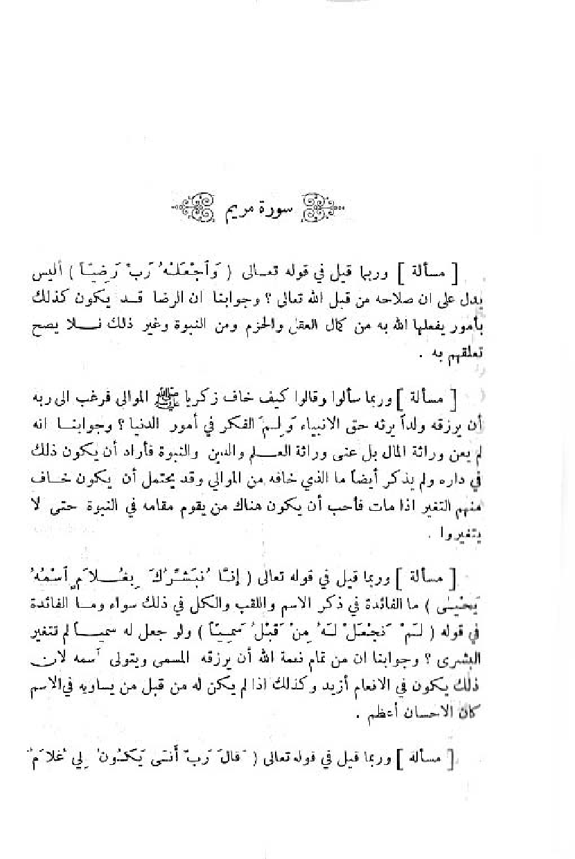 وربما سألوا وقالوا كيف خاف زكريا صلّى اللّه عليه وسلم الموالى فرغب الى ربه أن يرزقه ولدا يرثه حق الانبياء ولم الفكر في أمور الدنيا؟ وجوابنا انه لم يعن وراثة المال بل عنى وراثة العلم والدين والنبوة فأراد أن يكون ذلك في داره ولم يذكر أيضا ما الذي خافه من الموالي وقد يحتمل أن يكون خاف منهم التغير اذا مات فأحب أن يكون هناك من يقوم مقامه في النبوة حتى لا يتغيروا.