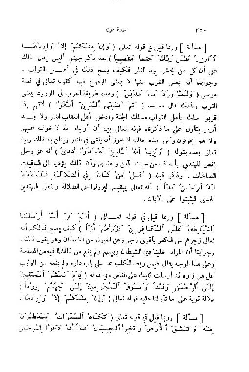 وجوابنا أنه بمعنى القرب منها لا بمعنى الوقوع فيها كقوله تعالى في قصة موسى (وَ لَمَّا وَرَدَ ماءَ مَدْيَنَ) وهذه طريقة العرب في الورود بمعنى القرب ولذلك قال بعده (ثُمَّ نُنَجِّي الَّذِينَ اتَّقَوْا) لانهم إذا قربوا سلك بأهل الثواب مسلك الجنة وأدخل أهل العقاب النار ولا بد أن يتأول على ما ذكرناه فإنه تعالى بين أن أولياء اللّه لا خوف عليهم ولا هم يحزنون ومن هذه حالته لا يجوز أن يلقى في النار ويظن به ذلك وبين تعالى بعده بقوله (وَ يَزِيدُ اللَّهُ الَّذِينَ اهْتَدَوْا هُدىً) أنه عز وجل يخص المهتدي بألطاف من حيث آمن واهتدى وأن ذلك يؤديه الى الباقيات الصالحات. وذكر قبله (قُلْ مَنْ كانَ فِي الضَّلالَةِ فَلْيَمْدُدْ لَهُ الرَّحْمنُ مَدًّا) أنه تعالى يبقيهم ليزولوا عن الضلالة ويفعل بالمهتدين الهدى ليثبتوا على الايمان.