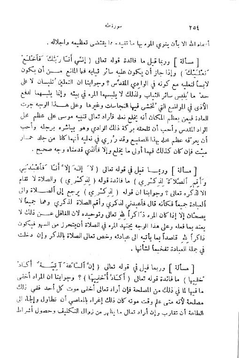 وربما قيل في قوله تعالى (لا إِلهَ إِلَّا أَنَا فَاعْبُدْنِي وأَقِمِ الصَّلاةَ لِذِكْرِي) ما فائدة قوله (لِذِكْرِي) والصلاة لا تقام الا لذكره تعالى؟ وجوابنا ان قوله (لِذِكْرِي) يرجع إلى الصلاة والى العبادة جميعا فكأنه قال فاعبدني لذكري وأقم الصلاة لذكري وهما جميعا لا يصحّان إلا إذا كان المرء ذاكرا للّه تعالى وتوحيده لان الغافل عن ذلك لا يعتد بما فعله وعلى هذا الوجه يجتهد المرء في الصلاة أن يتحرز من السهو فيكون ذاكرا للّه قاصدا بما يأتيه الى عبادته وخص تعالى الصلاة بالذكر وإن دخلت في جملة العبادة تفخيما لشأنها.