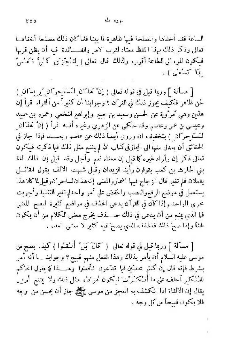 وربما قيل في قوله تعالى (إِنْ هذانِ لَساحِرانِ يُرِيدانِ) لحن ظاهر فكيف يجوز ذلك في القرآن؟ وجوابنا أن كثيرا من القراء قرأ إن هذين وهي مروية عن الحسن وسعيد بن جبير وإبراهيم النخعي وعمرو بن عبيد وعيسى بن عمر وعاصم وقد حكى عن الزهري وغيره أنه قرأ (إِنْ هذانِ لَساحِرانِ) بتخفيف ان وروي أيضا ذلك عن عاصم وبعد فإذا جاز في الحقائق أن يعدل عنها الى المجاز في كتاب اللّه لم يمتنع مثل ذلك فيما ذكرته فيكون تعالى ذكر إن وأراد غيره كما قيل إن معناه نعم وأجل وقد قيل إن ذلك لغة بني الحارث بن كعب يقولون رأينا الزيدان وقيل شبهت الالف بقول القائل يفعلان فلم تغير قال الزجاج فيها اضمار والمعنى إنه هذان لساحران وقيل لما كان هذا يستعمل في موضع الرفع والنصب والخفض على أمر واحد لم تغير التثنية وأجريت مجرى الواحد وإذا كان في القرآن يدعى الحذف في مواضع كثيرة ليصح المعنى فما الذي يمنع من أن يدعى في ذلك حذف يخرج معنى الكلام من أن يكون لحنا وإذا صحّ ذلك فالحذف الذي يصحّ فيه كثير لا معنى لعده.