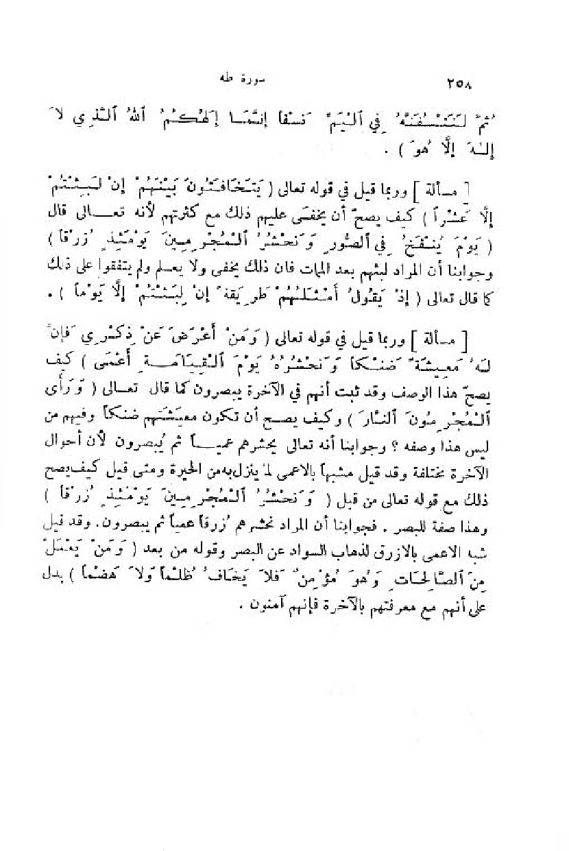 وربما قيل في قوله تعالى (يَتَخافَتُونَ بَيْنَهُمْ إِنْ لَبِثْتُمْ إِلَّا عَشْراً) كيف يصحّ أن يخفى عليهم ذلك مع كثرتهم لأنه تعالى قال (يَوْمَ يُنْفَخُ فِي الصُّورِ ونَحْشُرُ الْمُجْرِمِينَ يَوْمَئِذٍ زُرْقاً) وجوابنا أن المراد لبثهم بعد الممات فان ذلك يخفى ولا يعلم ولم يتفقوا على ذلك كما قال تعالى (إِذْ يَقُولُ أَمْثَلُهُمْ طَرِيقَةً إِنْ لَبِثْتُمْ إِلَّا يَوْماً).