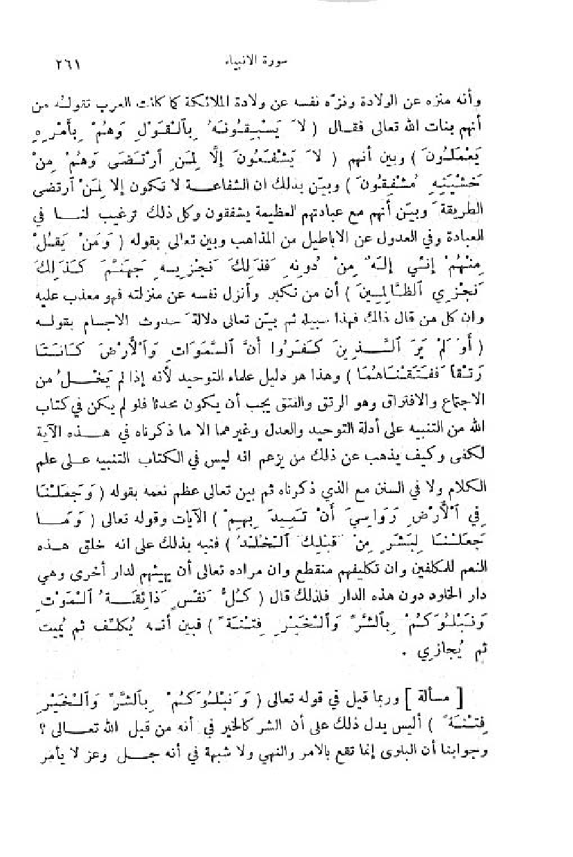وأنه منزه عن الولادة ونزّه نفسه عن ولادة الملائكة كما كانت العرب تقوله من أنهم بنات اللّه تعالى فقال (لا يَسْبِقُونَهُ بِالْقَوْلِ وهُمْ بِأَمْرِهِ يَعْمَلُونَ) وبين أنهم (لا يَشْفَعُونَ إِلَّا لِمَنِ ارْتَضى وهُمْ مِنْ خَشْيَتِهِ مُشْفِقُونَ) وبيّن بذلك ان الشفاعة لا تكون إلا لمن ارتضى الطريقة وبيّن أنهم مع عبادتهم العظيمة يشفقون وكل ذلك ترغيب لنا في العبادة وفي العدول عن الاباطيل من المذاهب وبين تعالى بقوله (وَ مَنْ يَقُلْ مِنْهُمْ إِنِّي إِلهٌ مِنْ دُونِهِ فَذلِكَ نَجْزِيهِ جَهَنَّمَ كَذلِكَ نَجْزِي الظَّالِمِينَ) أن من تكبر وأنزل نفسه عن منزلته فهو معذب عليه وان كل من قال ذلك فهذا سبيله ثمّ بيّن تعالى دلالة حدوث الاجسام بقوله (أَ ولَمْ يَرَ الَّذِينَ كَفَرُوا أَنَّ السَّماواتِ والْأَرْضَ كانَتا رَتْقاً فَفَتَقْناهُما) وهذا هو دليل علماء التوحيد لأنه إذا لم يخل من الاجتماع والافتراق وهو الرتق والفتق يجب أن يكون محدثا فلو لم يكن في كتاب اللّه من التنبيه على أدلة التوحيد والعدل وغيرهما الا ما ذكرناه في هذه الآية لكفى وكيف يذهب عن ذلك من يزعم انه ليس في الكتاب التنبيه على علم الكلام ولا في السنن مع الذي ذكرناه ثمّ بين تعالى عظم نعمه بقوله (وَ جَعَلْنا فِي الْأَرْضِ رَواسِيَ أَنْ تَمِيدَ بِهِمْ) الآيات وقوله تعالى (وَ ما جَعَلْنا لِبَشَرٍ مِنْ قَبْلِكَ الْخُلْدَ) فنبه بذلك على انه خلق هذه النعم للمكلفين وان تكليفهم منقطع وان مراده تعالى أن يهيئهم لدار أخرى وهي دار الخلود دون هذه الدار فلذلك قال (كُلُّ نَفْسٍ ذائِقَةُ الْمَوْتِ ونَبْلُوكُمْ بِالشَّرِّ والْخَيْرِ فِتْنَةً) فبين أنه يكلّف ثمّ يميت ثمّ يجازي.