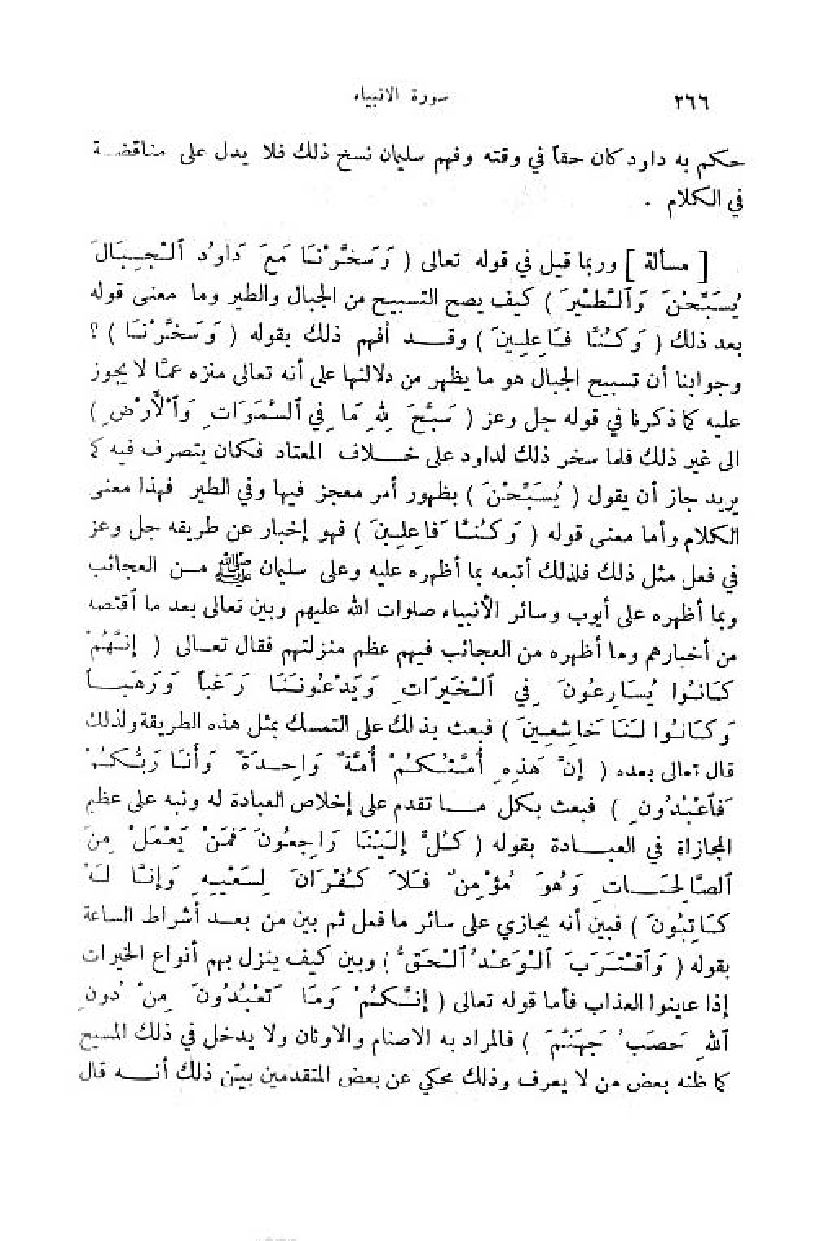 وجوابنا أن تسبيح الجبال هو ما يظهر من دلالتها على أنه تعالى منزه عمّا لا يجوز عليه كما ذكرنا في قوله جل وعز (سَبَّحَ لِلَّهِ ما فِي السَّماواتِ والْأَرْضِ) الى غير ذلك فلما سخر ذلك لداود على خلاف المعتاد فكان يتصرف فيه كما يريد جاز أن يقول (يُسَبِّحْنَ) بظهور أمر معجز فيها وفي الطير فهذا معنى الكلام وأما معنى قوله (وَ كُنَّا فاعِلِينَ) فهو إخبار عن طريقه جل وعز في فعل مثل ذلك فلذلك أتبعه بما أظهره عليه وعلى سليمان صلّى اللّه عليه وسلم من العجائب وبما أظهره على أيوب وسائر الأنبياء صلوات اللّه عليهم وبين تعالى بعد ما اقتصه من أخبارهم وما أظهره من العجائب فيهم عظم منزلتهم فقال تعالى (إِنَّهُمْ كانُوا يُسارِعُونَ فِي الْخَيْراتِ ويَدْعُونَنا رَغَباً ورَهَباً وكانُوا لَنا خاشِعِينَ) فبعث بذلك على التمسك بمثل هذه الطريقة ولذلك قال تعالى بعده (إِنَّ هذِهِ أُمَّتُكُمْ أُمَّةً واحِدَةً وأَنَا رَبُّكُمْ فَاعْبُدُونِ) فبعث بكل ما تقدم على إخلاص العبادة له ونبه على عظيم المجازاة في العبادة بقوله (كُلٌّ إِلَيْنا راجِعُونَ فَمَنْ يَعْمَلْ مِنَ الصَّالِحاتِ وهُوَ مُؤْمِنٌ فَلا كُفْرانَ لِسَعْيِهِ وإِنَّا لَهُ كاتِبُونَ) فبين أنه يجازي على سائر ما فعل ثمّ بين من بعد أشراط الساعة بقوله (وَ اقْتَرَبَ الْوَعْدُ الْحَقُّ) وبين كيف ينزل بهم أنواع الخيرات إذا عاينوا العذاب فأما قوله تعالى (إِنَّكُمْ وما تَعْبُدُونَ مِنْ دُونِ اللَّهِ حَصَبُ جَهَنَّمَ) فالمراد به الاصنام والاوثان ولا يدخل في ذلك المسيح كما ظنه بعض من لا يعرف وذلك محكي عن بعض المتقدمين بيّن ذلك أنه قال