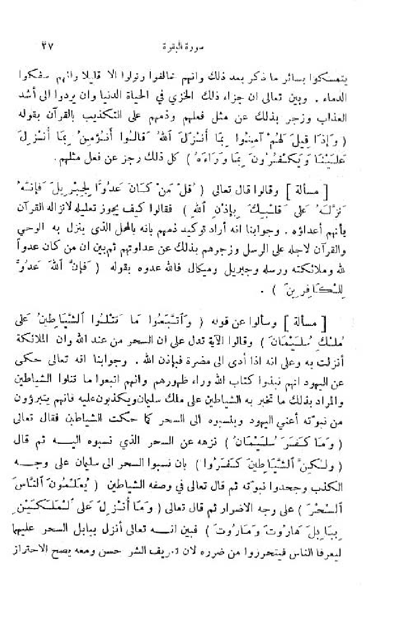 وسألوا عن قوله (وَ اتَّبَعُوا ما تَتْلُوا الشَّياطِينُ عَلى مُلْكِ سُلَيْمانَ) وقالوا الآية تدل على ان السحر من عند اللّه وان الملائكة أنزلت به وعلى انه اذا أدى الى مضرة فبإذن اللّه. وجوابنا انه تعالى حكى عن اليهود انهم نبذوا كتاب اللّه وراء ظهورهم وانهم اتبعوا ما تتلوا الشياطين والمراد بذلك ما تخبر به الشياطين على ملك سليمان ويكذبون عليه فانهم يتبرءون من نبوّته أعني اليهود وينسبوه الى السحر كما حكت الشياطين فقال تعالى (وَ ما كَفَرَ سُلَيْمانُ) نزهه عن السحر الذي نسبوه اليه ثمّ قال (وَ لكِنَّ الشَّياطِينَ كَفَرُوا) بان نسبوا السحر الى سليمان على وجه الكذب وجحدوا نبوّته ثمّ قال تعالى في وصفه الشياطين (يُعَلِّمُونَ النَّاسَ السِّحْرَ) على وجه الاضرار ثمّ قال تعالى (وَ ما أُنْزِلَ عَلَى الْمَلَكَيْنِ بِبابِلَ هارُوتَ ومارُوتَ) فبين انه تعالى أنزل ببابل السحر عليهما ليعرفا الناس فيتحرزوا من ضرره لان تعريف الشر حسن ومعه يصح الاحتراز