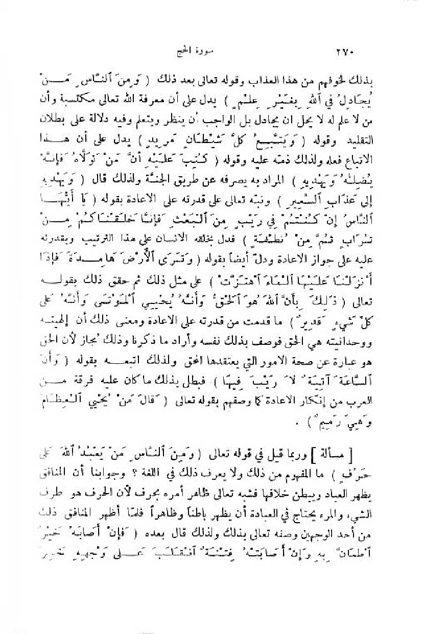 بذلك لخوفهم من هذا العذاب وقوله تعالى بعد ذلك (وَ مِنَ النَّاسِ مَنْ يُجادِلُ فِي اللَّهِ بِغَيْرِ عِلْمٍ) يدل على أن معرفة اللّه تعالى مكتسبة وأن من لا علم له لا يحل ان يجادل بل الواجب أن ينظر ويتعلم وفيه دلالة على بطلان التقليد وقوله (وَ يَتَّبِعُ كُلَّ شَيْطانٍ مَرِيدٍ) يدل على أن هذا الاتباع فعله ولذلك ذمّه عليه وقوله (كُتِبَ عَلَيْهِ أَنَّهُ مَنْ تَوَلَّاهُ فَأَنَّهُ يُضِلُّهُ ويَهْدِيهِ) المراد به يصرفه عن طريق الجنّة ولذلك قال (وَ يَهْدِيهِ إِلى عَذابِ السَّعِيرِ) ونبّه تعالى على قدرته على الاعادة بقوله (يا أَيُّهَا النَّاسُ إِنْ كُنْتُمْ فِي رَيْبٍ مِنَ الْبَعْثِ فَإِنَّا خَلَقْناكُمْ مِنْ تُرابٍ ثُمَّ مِنْ نُطْفَةٍ) فدل بخلقه الانسان على هذا الترتيب وبقدرته عليه على جواز الاعادة ودلّ أيضا بقوله (وَ تَرَى الْأَرْضَ هامِدَةً فَإِذا أَنْزَلْنا عَلَيْهَا الْماءَ اهْتَزَّتْ) على مثل ذلك ثمّ حقق ذلك بقوله تعالى (ذلِكَ بِأَنَّ اللَّهَ هُوَ الْحَقُّ وأَنَّهُ يُحْيِ الْمَوْتى وأَنَّهُ عَلى كُلِّ شَيْءٍ قَدِيرٌ) ما قدمت من قدرته على الاعادة ومعنى ذلك أن إلهيته ووحدانيته هي الحق فوصف بذلك نفسه وأراد ما ذكرنا وذلك مجاز لأن الحق هو عبارة عن صحة الامور التي يعتقدها المحق ولذلك اتبعه بقوله (وَ أَنَّ السَّاعَةَ آتِيَةٌ لا رَيْبَ فِيها) فبطل بذلك ما كان عليه فرقة من العرب من إنكار الاعادة كما وصفهم بقوله تعالى (قالَ مَنْ يُحْيِ الْعِظامَ وهِيَ رَمِيمٌ).
