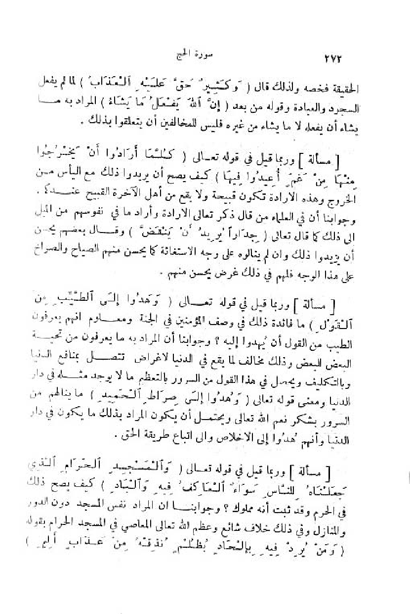 وربما قيل في قوله تعالى (وَ الْمَسْجِدِ الْحَرامِ الَّذِي جَعَلْناهُ لِلنَّاسِ سَواءً الْعاكِفُ فِيهِ والْبادِ) كيف يصح ذلك في الحرم وقد ثبت أنه مملوك؟ وجوابنا ان المراد نفس المسجد دون الدور والمنازل وفي ذلك خلاف شائع وعظم اللّه تعالى المعاصي في المسجد الحرام بقوله (وَ مَنْ يُرِدْ فِيهِ بِإِلْحادٍ بِظُلْمٍ نُذِقْهُ مِنْ عَذابٍ أَلِيمٍ)