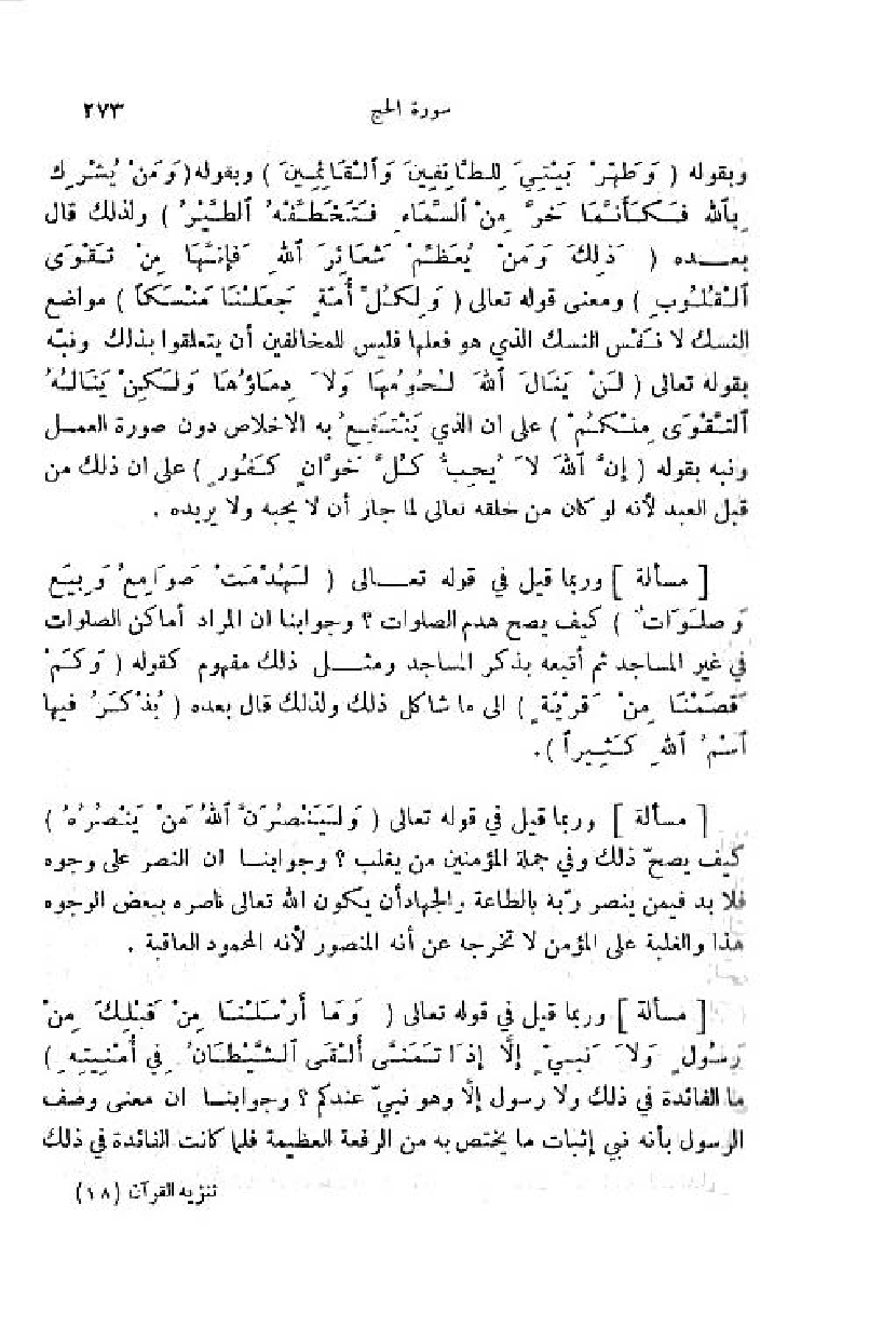 وربما قيل في قوله تعالى (لَهُدِّمَتْ صَوامِعُ وبِيَعٌ وصَلَواتٌ) كيف يصح هدم الصلوات؟ وجوابنا ان المراد أماكن الصلوات في غير المساجد ثمّ أتبعه بذكر المساجد ومثل ذلك مفهوم كقوله (وَ كَمْ قَصَمْنا مِنْ قَرْيَةٍ) الى ما شاكل ذلك ولذلك قال بعده (يُذْكَرُ فِيهَا اسْمُ اللَّهِ كَثِيراً).