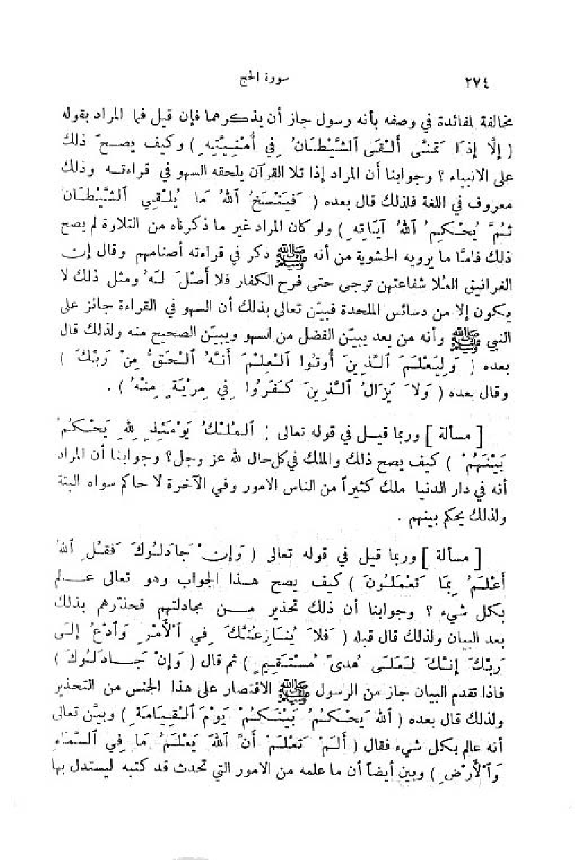 مخالفة للفائدة في وصفه بأنه رسول جاز أن يذكرهما فإن قيل فما المراد بقوله (إِلَّا إِذا تَمَنَّى أَلْقَى الشَّيْطانُ فِي أُمْنِيَّتِهِ) وكيف يصحّ ذلك على الانبياء؟ وجوابنا أن المراد إذا تلا القرآن يلحقه السهو في قراءته وذلك معروف في اللغة فلذلك قال بعده (فَيَنْسَخُ اللَّهُ ما يُلْقِي الشَّيْطانُ ثُمَّ يُحْكِمُ اللَّهُ آياتِهِ) ولو كان المراد غير ما ذكرناه من التلاوة لم يصح ذلك فامّا ما يرويه الحشوية من أنه صلّى اللّه عليه وسلم ذكر في قراءته أصنامهم وقال إن الغرانيق العلا شفاعتهن ترجى حتى فرح الكفار فلا أصل له ومثل ذلك لا يكون إلا من دسائس الملحدة فبيّن تعالى بذلك أن السهو في القراءة جائز على النبي صلّى اللّه عليه وسلم وأنه من يعد يبيّن الفضل من السهو ويبيّن الصحيح منه ولذلك قال بعده (وَ لِيَعْلَمَ الَّذِينَ أُوتُوا الْعِلْمَ أَنَّهُ الْحَقُّ مِنْ رَبِّكَ) وقال بعده (وَ لا يَزالُ الَّذِينَ كَفَرُوا فِي مِرْيَةٍ مِنْهُ).