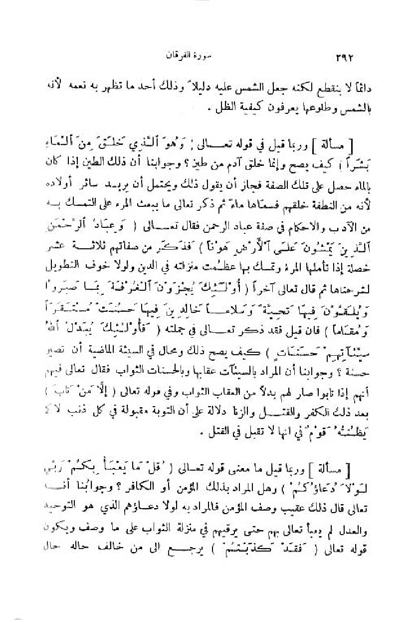 وربما قيل في قوله تعالى (وَ هُوَ الَّذِي خَلَقَ مِنَ الْماءِ بَشَراً) كيف يصح وإنما خلق آدم من طين؟ وجوابنا أن ذلك الطين إذا كان بالماء حصل على تلك الصفة فجاز أن يقول ذلك ويحتمل أن يريد سائر أولاده لأنه من النطفة خلقهم فسمّاها ماء ثمّ ذكر تعالى ما يبعث المرء على التمسك به من الآداب والاحكام في صفة عباد الرحمن فقال تعالى (وَ عِبادُ الرَّحْمنِ الَّذِينَ يَمْشُونَ عَلَى الْأَرْضِ هَوْناً) فذكر من صفاتهم ثلاثة عشر خصلة إذا تأملها المرء وتمسك بها عظمت منزلته في الدين ولو لا خوف التطويل لشرحناها ثمّ قال تعالى آخرا (أُوْلئِكَ يُجْزَوْنَ الْغُرْفَةَ بِما صَبَرُوا ويُلَقَّوْنَ فِيها تَحِيَّةً وسَلاماً خالِدِينَ فِيها حَسُنَتْ مُسْتَقَرًّا ومُقاماً) فان قيل فقد ذكر تعالى في جملته (فَأُوْلئِكَ يُبَدِّلُ اللَّهُ سَيِّئاتِهِمْ حَسَناتٍ) كيف يصح ذلك ومحال في السيئة الماضية أن تصير حسنة؟ وجوابنا أن المراد بالسيّئات عقابها وبالحسنات الثواب فقال تعالى فيهم أنهم إذا تابوا صار لهم بدلا من العقاب الثواب وفي قوله تعالى (إِلَّا مَنْ تابَ) بعد ذلك الكفر والقتل والزنا دلالة على أن التوبة مقبولة في كل ذنب لا كما يظنّه قوم في انها لا تقبل في القتل.