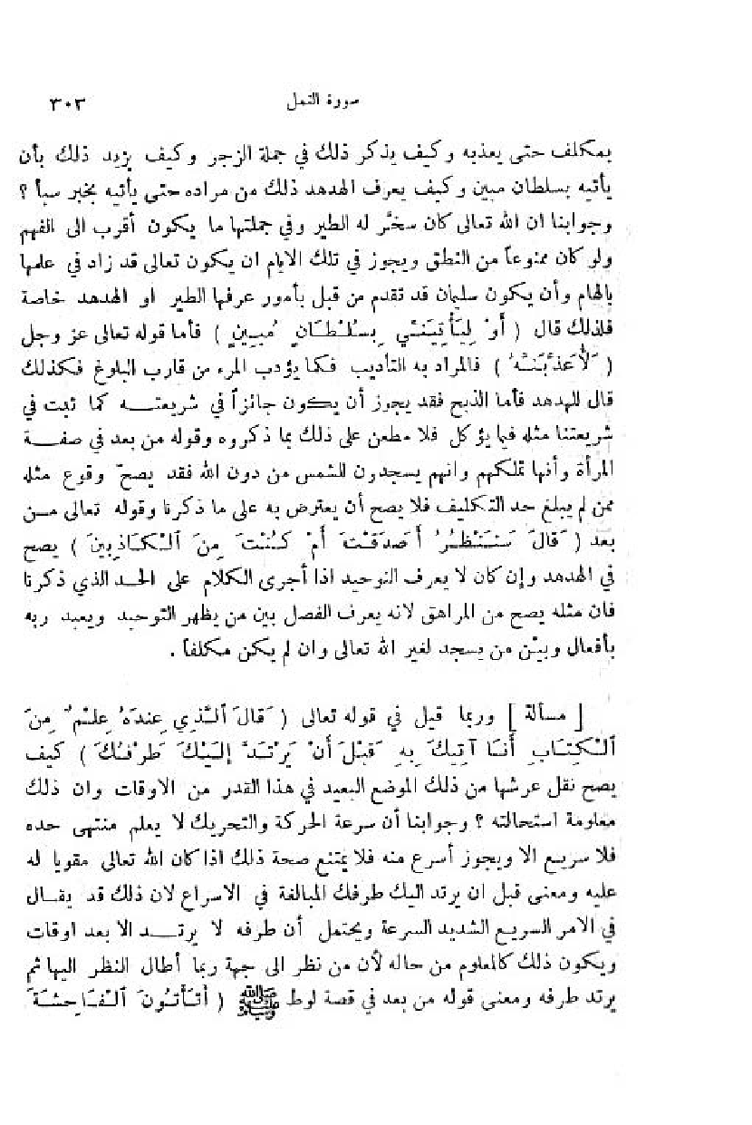 وجوابنا ان اللّه تعالى كان سخّر له الطير وفي جملتها ما يكون أقرب الى الفهم ولو كان ممنوعا من النطق ويجوز في تلك الايام ان يكون تعالى قد زاد في علمها بالهام وأن يكون سليمان قد تقدم من قبل بأمور عرفها الطير او الهدهد خاصة فلذلك قال (أَوْ لَيَأْتِيَنِّي بِسُلْطانٍ مُبِينٍ) فأما قوله تعالى عز وجل (لَأُعَذِّبَنَّهُ) فالمراد به التأديب فكما يؤدب المرء من قارب البلوغ فكذلك قال للهدهد فأما الذبح فقد يجوز أن يكون جائزا في شريعته كما ثبت في شريعتنا مثله فيما يؤكل فلا مطعن على ذلك بما ذكروه وقوله من بعد في صفة المرأة وأنها تملكهم وانهم يسجدون للشمس من دون اللّه فقد يصحّ وقوع مثله ممن لم يبلغ حد التكليف فلا يصح أن يعترض به على ما ذكرنا وقوله تعالى من بعد (قالَ سَنَنْظُرُ أَ صَدَقْتَ أَمْ كُنْتَ مِنَ الْكاذِبِينَ) يصح في الهدهد وإن كان لا يعرف التوحيد اذا أجرى الكلام على الحد الذي ذكرنا فان مثله يصح من المراهق لانه يعرف الفصل بين من يظهر التوحيد ويعبد ربه بأفعال وبين من يسجد لغير اللّه تعالى وان لم يكن مكلفا.