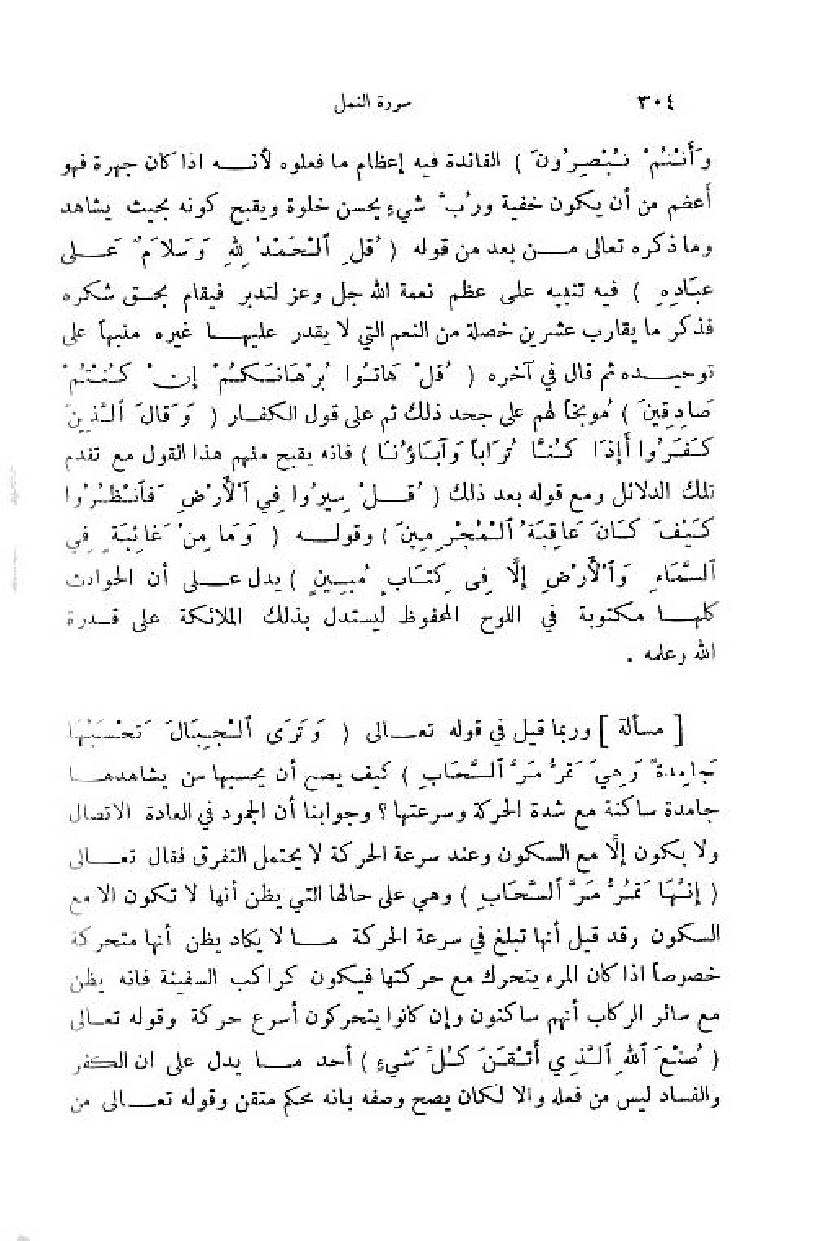 وربما قيل في قوله تعالى (وَ تَرَى الْجِبالَ تَحْسَبُها جامِدَةً وهِيَ تَمُرُّ مَرَّ السَّحابِ) كيف يصح أن يحسبها من يشاهدها جامدة ساكنة مع شدة الحركة وسرعتها؟ وجوابنا أن الجمود في العادة الاتصال ولا يكون إلّا مع السكون وعند سرعة الحركة لا يحتمل التفرق فقال تعالى (وَ هِيَ تَمُرُّ مَرَّ السَّحابِ) وهي على حالها التي يظن أنها لا تكون الا مع السكون وقد قيل أنها تبلغ في سرعة الحركة ما لا يكاد يظن أنها متحركة خصوصا اذا كان المرء يتحرك مع حركتها فيكون كراكب السفينة فانه يظن مع سائر الركاب أنهم ساكنون وإن كانوا يتحركون أسرع حركة وقوله تعالى (صُنْعَ اللَّهِ الَّذِي أَتْقَنَ كُلَّ شَيْءٍ) أحد ما يدل على ان الكفر والفساد ليس من فعله والا لكان يصح وصفه بانه محكم متقن وقوله تعالى من