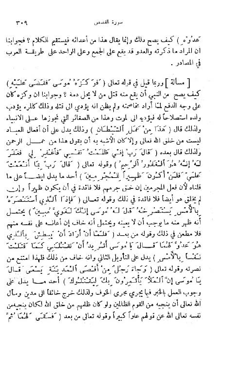 وربما قيل في قوله تعالى (فَوَكَزَهُ مُوسى فَقَضى عَلَيْهِ) كيف يصح من النبي أن يقع منه قتل من لا يحل دمه؟ وجوابنا ان وكزه كان على وجه الدفع لمّا أراد مخاصمته ولم يظن انه يؤدي الى قتله وذلك كالمرء يؤدب ولده استصلاحا له فيؤديه الى الموت وهذا من الصغائر التي نجوزها على الانبياء ولذلك قال (هذا مِنْ عَمَلِ الشَّيْطانِ) وذلك يدل على أن أفعال العباد ليست من خلق اللّه تعالى وإلا كان الأشبه به أن يقول هذا من عمل الرحمن ولذلك قال بعده (قالَ رَبِّ إِنِّي ظَلَمْتُ نَفْسِي فَاغْفِرْ لِي فَغَفَرَ لَهُ إِنَّهُ هُوَ الْغَفُورُ الرَّحِيمُ) وقوله تعالى (قالَ رَبِّ بِما أَنْعَمْتَ عَلَيَّ فَلَنْ أَكُونَ ظَهِيراً لِلْمُجْرِمِينَ) أحد ما يدل ايضا على ما قلناه لأن فعل المجرمين إن خلق جرمهم فلا فائدة في أن يكون ظهيرا وإن لم يخلق هو أيضا فلا فائدة في ذلك وقوله تعالى (فَإِذَا الَّذِي اسْتَنْصَرَهُ بِالْأَمْسِ يَسْتَصْرِخُهُ قالَ لَهُ مُوسى إِنَّكَ لَغَوِيٌّ مُبِينٌ) يحتمل أنه ظهر منه ما يوجب أن لا يعينه ويحتمل أنه خاف إن أعانه على نفسه منهم فلا مطعن في ذلك وقوله من بعد (فَلَمَّا أَنْ أَرادَ أَنْ يَبْطِشَ بِالَّذِي هُوَ عَدُوٌّ لَهُما قالَ يا مُوسى أَ تُرِيدُ أَنْ تَقْتُلَنِي كَما قَتَلْتَ نَفْساً بِالْأَمْسِ) يدل على التأويل الثاني وانه خاف من ذلك فلهذا امتنع من نصرته وقوله تعالى (وَ جاءَ رَجُلٌ مِنْ أَقْصَى الْمَدِينَةِ يَسْعى قالَ يا مُوسى إِنَّ الْمَلَأَ يَأْتَمِرُونَ بِكَ لِيَقْتُلُوكَ) أحد ما يدل على وجوب العمل بالخبر فيما يجري مجرى الخوف ولذلك خرج خائفا الى مدين وسأل اللّه تعالى أن ينجيه من القوم الظالمين ولو كان ظلمهم من خلق اللّه لكان ينجيه من نفسه تعالى اللّه عن قولهم علوا كبيرا وقوله تعالى من بعد (فَسَقى لَهُما ثُمَ