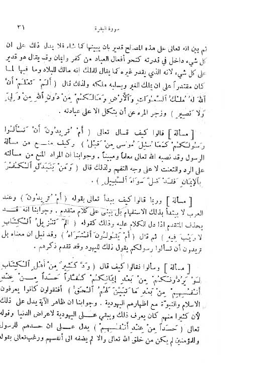 قالوا كيف قال تعالى (أَمْ تُرِيدُونَ أَنْ تَسْئَلُوا رَسُولَكُمْ كَما سُئِلَ مُوسى مِنْ قَبْلُ) وكيف منع من مسألة الرسول وقد نصبه اللّه تعالى معلما ومبينا. وجوابنا ان المراد المنع من مسألته على الرد والتعنت لا على وجه التفهم ولذلك قال (وَ مَنْ يَتَبَدَّلِ الْكُفْرَ بِالْإِيمانِ فَقَدْ ضَلَّ سَواءَ السَّبِيلِ).