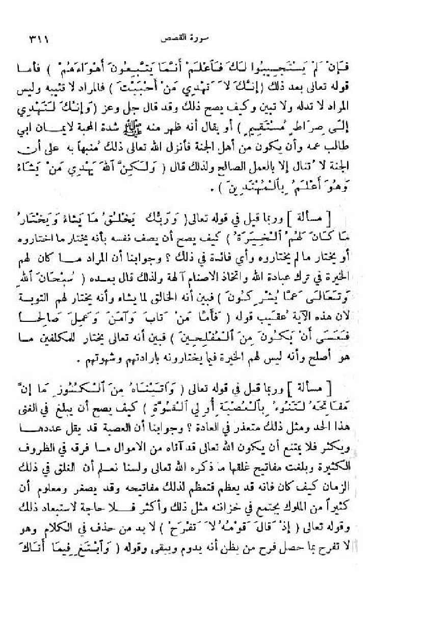 فَإِنْ لَمْ يَسْتَجِيبُوا لَكَ فَاعْلَمْ أَنَّما يَتَّبِعُونَ أَهْواءَهُمْ) فأما قوله تعالى بعد ذلك (إِنَّكَ لا تَهْدِي مَنْ أَحْبَبْتَ) فالمراد لا تثيبه وليس المراد لا تدله ولا تبين وكيف يصح ذلك وقد قال جل وعز (وَ إِنَّكَ لَتَهْدِي إِلى صِراطٍ مُسْتَقِيمٍ) أو يقال أنه ظهر منه صلّى اللّه عليه وسلم شدة المحبة لإيمان ابي طالب عمه وأن يكون من أهل الجنة فأنزل اللّه تعالى ذلك منبها به على أن الجنة لا تنال إلا بالعمل الصالح ولذلك قال (وَ لكِنَّ اللَّهَ يَهْدِي مَنْ يَشاءُ وهُوَ أَعْلَمُ بِالْمُهْتَدِينَ).