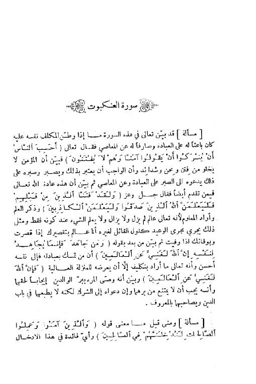 قد بيّن تعالى في هذه السورة ما إذا وطّن المكلف نفسه عليه كان باعثا له على العبادة وصارفا له عن المعاصي فقال تعالى (أَ حَسِبَ النَّاسُ أَنْ يُتْرَكُوا أَنْ يَقُولُوا آمَنَّا وهُمْ لا يُفْتَنُونَ) فبيّن أن المؤمن لا يخلو من فتن ومحن وشدائد وأن الواجب أن يعتبر بذلك ويصبر وصبره على ذلك يدعوه الى الصبر على العبادة وعن المعاصي ثمّ بيّن أن هذه عادة اللّه تعالى فيمن تقدم أيضا فقال جل وعز (وَ لَقَدْ فَتَنَّا الَّذِينَ مِنْ قَبْلِهِمْ فَلَيَعْلَمَنَّ اللَّهُ الَّذِينَ صَدَقُوا ولَيَعْلَمَنَّ الْكاذِبِينَ) وذكر العلم وأراد المعلوم لأنه تعالى عالم لم يزل ولا يزال ولا يعلم الشيء عند كونه فقط ومثل ذلك يجري مجرى الوعيد كقول القائل لغيره أنا عالم بتقصيرك إذا قصرت وبوفائك اذا وفيت ثمّ بيّن من بعد بقوله (وَ مَنْ جاهَدَ فَإِنَّما يُجاهِدُ لِنَفْسِهِ إِنَّ اللَّهَ لَغَنِيٌّ عَنِ الْعالَمِينَ) أن من تمسك بعبادته فإلى نفسه أحسن وأنه تعالى ما أراد بتكليفه إلّا أن يعرضه للمنزلة العالية (إِنَّ اللَّهَ لَغَنِيٌّ عَنِ الْعالَمِينَ) وبيّن أنه وصّى المرء ببرّ الوالدين إيجابا لحقهما وأنه يجب أن لا يمتنع من برهما وإن دعواه إلى الشرك لكنه لا يطيعهما في باب الدين ويصاحبهما بالمعروف.