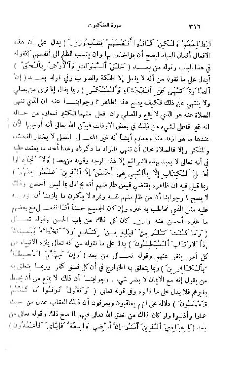 (لِيَظْلِمَهُمْ ولكِنْ كانُوا أَنْفُسَهُمْ يَظْلِمُونَ) يدل على ان هذه الافعال أفعال العباد ليصح أن يؤاخذوا بها وان ينسب الظلم الى أنفسهم كما نقوله في هذا الباب وقوله من بعد (خَلَقَ السَّماواتِ والْأَرْضَ بِالْحَقِّ) أ يدل على ما نقوله من أنه لا يفعل إلا الحكمة والصواب وفي قوله بعد (إِنَّ الصَّلاةَ تَنْهى عَنِ الْفَحْشاءِ والْمُنْكَرِ) ربما يقال إنا نرى من يصلي ولا ينتهي عن ذلك فكيف يصح هذا الظاهر؟ وجوابنا عنه ان الذي تنهى الصلاة عنه هو الذي لا يقع والمصلي وان فعل منهما الكثير فمعلوم من حاله انه غير فاعل لشيء من ذلك في بعض الاوقات فبيّن اللّه تعالى أنه أوجبها لأن عندها ما هو ازيد منه ومعلوم أيضا أنه غير فاعل المصلى لا يختار الفحشاء والمنكر وإلا فالصلاة محال أن تنهى فالمراد ما ذكرناه وهذا أحد ما يعتمد عليه في أنه تعالى لا يعبد بهذه الشرائع إلا لهذا الوجه وقوله من بعد (وَ لا تُجادِلُوا أَهْلَ الْكِتابِ إِلَّا بِالَّتِي هِيَ أَحْسَنُ إِلَّا الَّذِينَ ظَلَمُوا مِنْهُمْ) ربما قيل فيه ان ظاهره يقتضي فيمن ظلم منهم أنه يجادل بما ليس أحسن وذلك لا يصح؟ وجوابنا أن من ظلم منهم نفسه وتمرد لا يكون ما يلزمنا أن نرد به عليه مثل الذي نخاطب به غيره وإن كان الجميع حسنا أنّا نفعل مع بعضهم ما غيره أحسن منه وان كان كل ذلك من باب الحسن وقوله تعالى (وَ ما كُنْتَ تَتْلُوا مِنْ قَبْلِهِ مِنْ كِتابٍ ولا تَخُطُّهُ بِيَمِينِكَ إِذاً لَارْتابَ الْمُبْطِلُونَ) يدل على ما نقوله من أنه تعالى ينزه الانبياء عن كل أمر ينفر عنهم وقوله تعالى من بعد (وَ إِنَّ جَهَنَّمَ لَمُحِيطَةٌ بِالْكافِرِينَ) ربما يتعلق به الخوارج في أن كل فسق كفر وربما يتعلق به من يقول إنه مع الايمان لا يضر شيء. وجوابنا أن ذلك لا يمنع من أن يحيط بغيرهم فلا يدل على ما قالوه وفي قوله تعالى (وَ يَقُولُ ذُوقُوا ما كُنْتُمْ تَعْمَلُونَ) دلالة على انهم يعاقبون ويعرفون أن ذلك العقاب عدل من حيث عملوا وأذنبوا ولو كان ذلك من خلق اللّه تعالى فيهم لما صح ذلك وقوله تعالى من بعد (يا عِبادِيَ الَّذِينَ آمَنُوا إِنَّ أَرْضِي واسِعَةٌ فَإِيَّايَ فَاعْبُدُونِ)