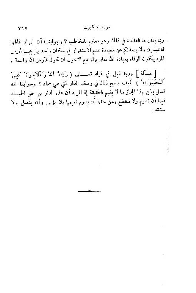 وربما قيل في قوله تعالى (وَ إِنَّ الدَّارَ الْآخِرَةَ لَهِيَ الْحَيَوانُ) كيف يصح ذلك في وصف الدار التي هي جماد؟ وجوابنا انه تعالى بيّن بهذا المجاز ما لا يفهم بالحقيقة إذ المراد أن هذه الدار من حق الحياة فيها أن تدوم ولا تنقطع ومن حقها أن يدوم نعيمها بلا بؤس وأن يتصل ولا مشقة.