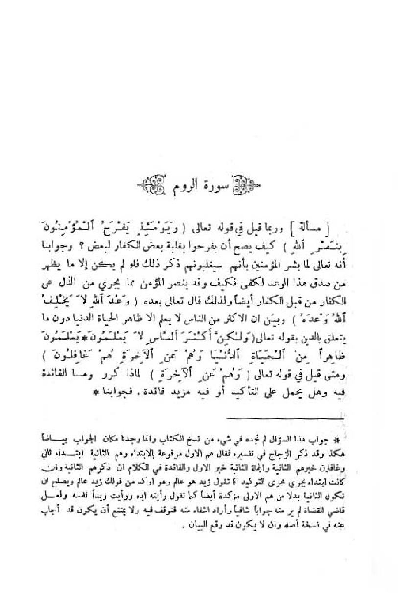 وربما قيل في قوله تعالى (وَ يَوْمَئِذٍ يَفْرَحُ الْمُؤْمِنُونَ بِنَصْرِ اللَّهِ) كيف يصح أن يفرحوا بغلبة بعض الكفار لبعض؟ وجوابنا أنه تعالى لما بشر المؤمنين بأنهم سيغلبونهم ذكر ذلك فلو لم يكن إلا ما يظهر من صدق هذا الوعد لكفى فكيف وقد ينصر المؤمن مما يجري من الذل على الكفار من قبل الكفار أيضا ولذلك قال تعالى بعده (وَعْدَ اللَّهِ لا يُخْلِفُ اللَّهُ وَعْدَهُ) وبيّن ان الاكثر من الناس لا يعلم الا ظاهر الحياة الدنيا دون ما يتعلق بالدين بقوله تعالى (وَ لكِنَّ أَكْثَرَ النَّاسِ لا يَعْلَمُونَ. يَعْلَمُونَ ظاهِراً مِنَ الْحَياةِ الدُّنْيا وهُمْ عَنِ الْآخِرَةِ هُمْ غافِلُونَ) ومتى قيل في قوله تعالى (وَ هُمْ عَنِ الْآخِرَةِ) لما ذا كرر وما الفائدة فيه وهل يحمل على التأكيد أو فيه مزيد فائدة. فجوابنا «*»