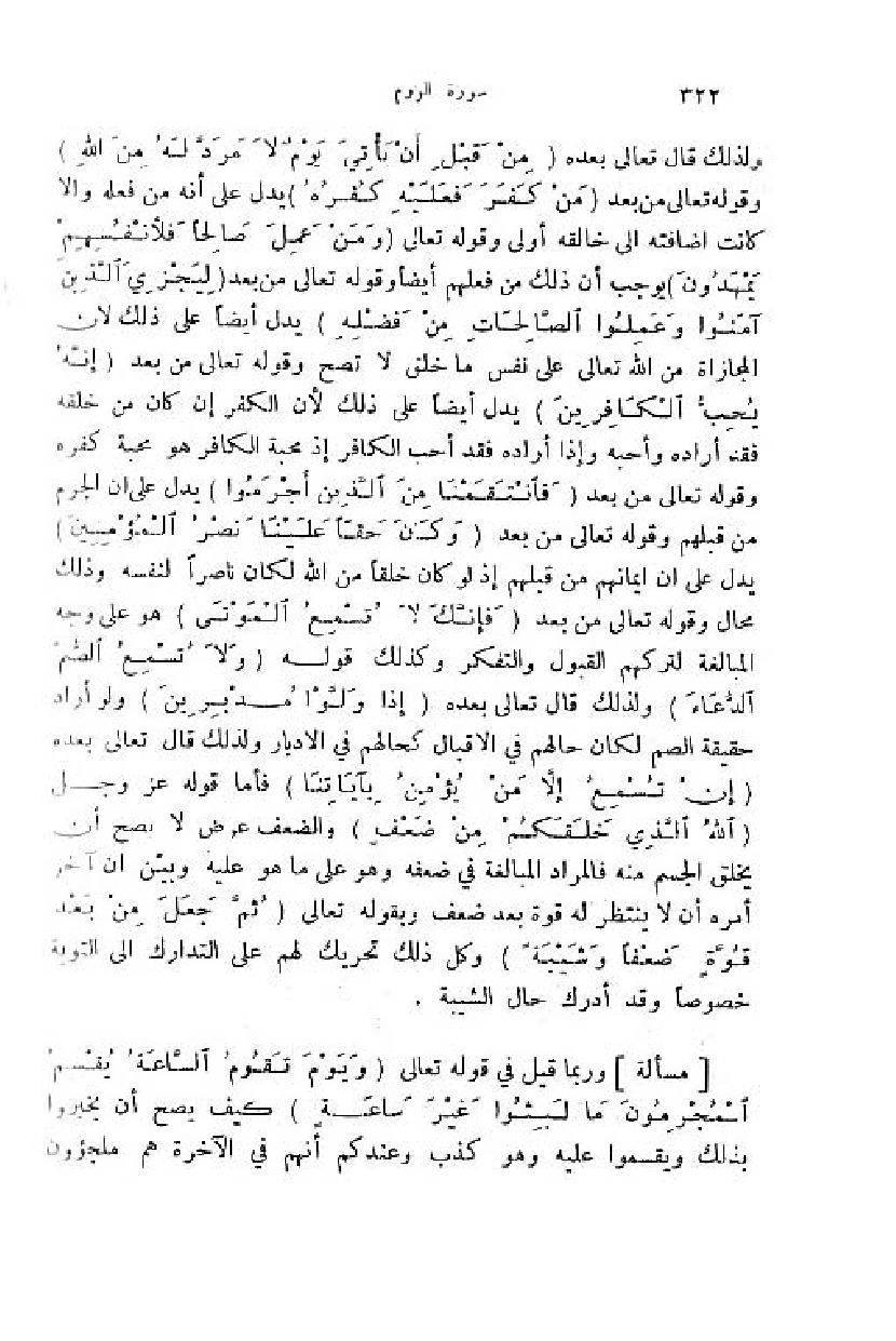 ولذلك قال تعالى بعده (مِنْ قَبْلِ أَنْ يَأْتِيَ يَوْمٌ لا مَرَدَّ لَهُ مِنَ اللَّهِ) وقوله تعالى من بعد (مَنْ كَفَرَ فَعَلَيْهِ كُفْرُهُ) يدل على أنه من فعله والا كانت اضافته الى خالقه أولى وقوله تعالى (وَ مَنْ عَمِلَ صالِحاً فَلِأَنْفُسِهِمْ يَمْهَدُونَ) يوجب أن ذلك من فعلهم أيضا وقوله تعالى من بعد (لِيَجْزِيَ الَّذِينَ آمَنُوا وعَمِلُوا الصَّالِحاتِ مِنْ فَضْلِهِ) يدل أيضا على ذلك لان المجازاة من اللّه تعالى على نفس ما خلق لا تصح وقوله تعالى من بعد (إِنَّهُ لا يُحِبُّ الْكافِرِينَ) يدل أيضا على ذلك لأن الكفر إن كان من خلقه فقد أراده وأحبه وإذا أراده فقد أحب الكافر إذ محبة الكافر هو محبة كفره وقوله تعالى من بعد (فَانْتَقَمْنا مِنَ الَّذِينَ أَجْرَمُوا) يدل على ان الجرم من قبلهم وقوله تعالى من بعد (وَ كانَ حَقًّا عَلَيْنا نَصْرُ الْمُؤْمِنِينَ) يدل على ان ايمانهم من قبلهم إذ لو كان خلقا من اللّه لكان ناصرا لنفسه وذلك محال وقوله تعالى من بعد (فَإِنَّكَ لا تُسْمِعُ الْمَوْتى) هو على وجه المبالغة لتركهم القبول والتفكر وكذلك قوله (وَ لا تُسْمِعُ الصُّمَّ الدُّعاءَ) ولذلك قال تعالى بعده (إِذا وَلَّوْا مُدْبِرِينَ) ولو أراد حقيقة الصم لكان حالهم في الاقبال كحالهم في الادبار ولذلك قال تعالى بعده (إِنْ تُسْمِعُ إِلَّا مَنْ يُؤْمِنُ بِآياتِنا) فأما قوله عز وجل (اللَّهُ الَّذِي خَلَقَكُمْ مِنْ ضَعْفٍ) والضعف عرض لا يصح أن يخلق الجسم منه فالمراد المبالغة في ضعفه وهو على ما هو عليه وبيّن ان آخر أمره أن لا ينتظر له قوة بعد ضعف وبقوله تعالى (ثُمَّ جَعَلَ مِنْ بَعْدِ قُوَّةٍ ضَعْفاً وشَيْبَةً) وكل ذلك تحريك لهم على التدارك الى التوبة خصوصا وقد أدرك حال الشيبة.