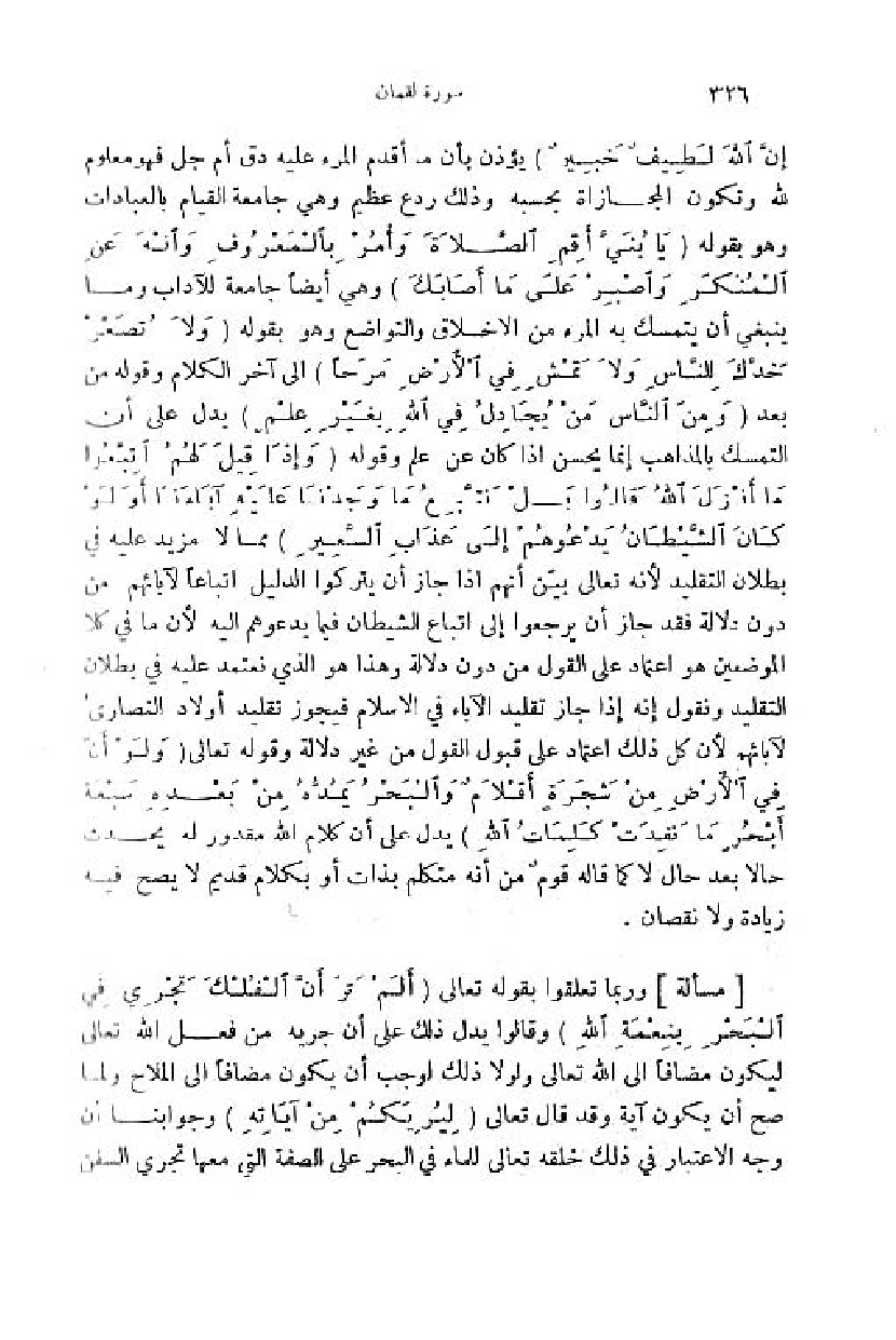 إِنَّ اللَّهَ لَطِيفٌ خَبِيرٌ) يؤذن بأن ما أقدم المرء عليه دق أم جل فهو معلوم للّه وتكون المجازاة بحسبه وذلك ردع عظيم وهي جامعة القيام بالعبادات وهو بقوله (يا بُنَيَّ أَقِمِ الصَّلاةَ وأْمُرْ بِالْمَعْرُوفِ وانْهَ عَنِ الْمُنْكَرِ واصْبِرْ عَلى ما أَصابَكَ) وهي أيضا جامعة للآداب وما ينبغي أن يتمسك به المرء من الاخلاق والتواضع وهو بقوله (وَ لا تُصَعِّرْ خَدَّكَ لِلنَّاسِ ولا تَمْشِ فِي الْأَرْضِ مَرَحاً) الى آخر الكلام وقوله من بعد (وَ مِنَ النَّاسِ مَنْ يُجادِلُ فِي اللَّهِ بِغَيْرِ عِلْمٍ) يدل على أن التمسك بالمذاهب إنما يحسن اذا كان عن علم وقوله (وَ إِذا قِيلَ لَهُمُ اتَّبِعُوا ما أَنْزَلَ اللَّهُ قالُوا بَلْ نَتَّبِعُ ما وَجَدْنا عَلَيْهِ آباءَنا أَ ولَوْ كانَ الشَّيْطانُ يَدْعُوهُمْ إِلى عَذابِ السَّعِيرِ) مما لا مزيد عليه في بطلان التقليد لأنه تعالى بيّن أنهم اذا جاز أن يتركوا الدليل اتباعا لآبائهم من دون دلالة فقد جاز أن يرجعوا إلى اتباع الشيطان فيما يدعوهم اليه لأن ما في كلا الموضعين هو اعتماد على القول من دون دلالة وهذا هو الذي نعتمد عليه في بطلان التقليد ونقول إنه إذا جاز تقليد الآباء في الاسلام فيجوز تقليد أولاد النصارى لآبائهم لأن كل ذلك اعتماد على قبول القول من غير دلالة وقوله تعالى (وَ لَوْ أَنَّ ما فِي الْأَرْضِ مِنْ شَجَرَةٍ أَقْلامٌ والْبَحْرُ يَمُدُّهُ مِنْ بَعْدِهِ سَبْعَةُ أَبْحُرٍ ما نَفِدَتْ كَلِماتُ اللَّهِ) يدل على أن كلام اللّه مقدور له يحدث حالا بعد حال لا كما قاله قوم من أنه متكلم بذات أو بكلام قديم لا يصح فيه زيادة ولا نقصان.
