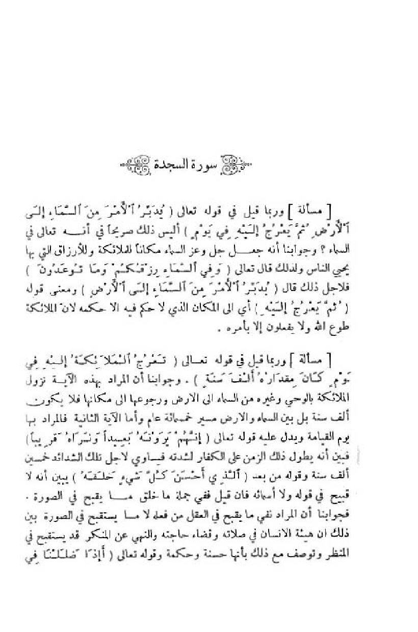 وربما قيل في قوله تعالى (تَعْرُجُ الْمَلائِكَةُ والرُّوحُ إِلَيْهِ فِي يَوْمٍ كانَ مِقْدارُهُ خَمْسِينَ أَلْفَ سَنَةٍ). وجوابنا أن المراد بهذه الآية نزول الملائكة بالوحي وغيره من السماء الى الارض ورجوعها الى مكانها فلا يكون ألف سنة بل بين السماء والارض مسير خمسمائة عام وأما الآية الثانية فالمراد بها يوم القيامة ويدل عليه قوله تعالى (إِنَّهُمْ يَرَوْنَهُ بَعِيداً ونَراهُ قَرِيباً) فبين أنه يطول ذلك الزمن على الكفار لشدته فيساوي لاجل تلك الشدائد خمسين ألف سنة وقوله من بعد (الَّذِي أَحْسَنَ كُلَّ شَيْءٍ خَلَقَهُ) يبين أنه لا قبيح في قوله ولا أسمائه فان قيل ففي جملة ما خلق ما يقبح في الصورة.