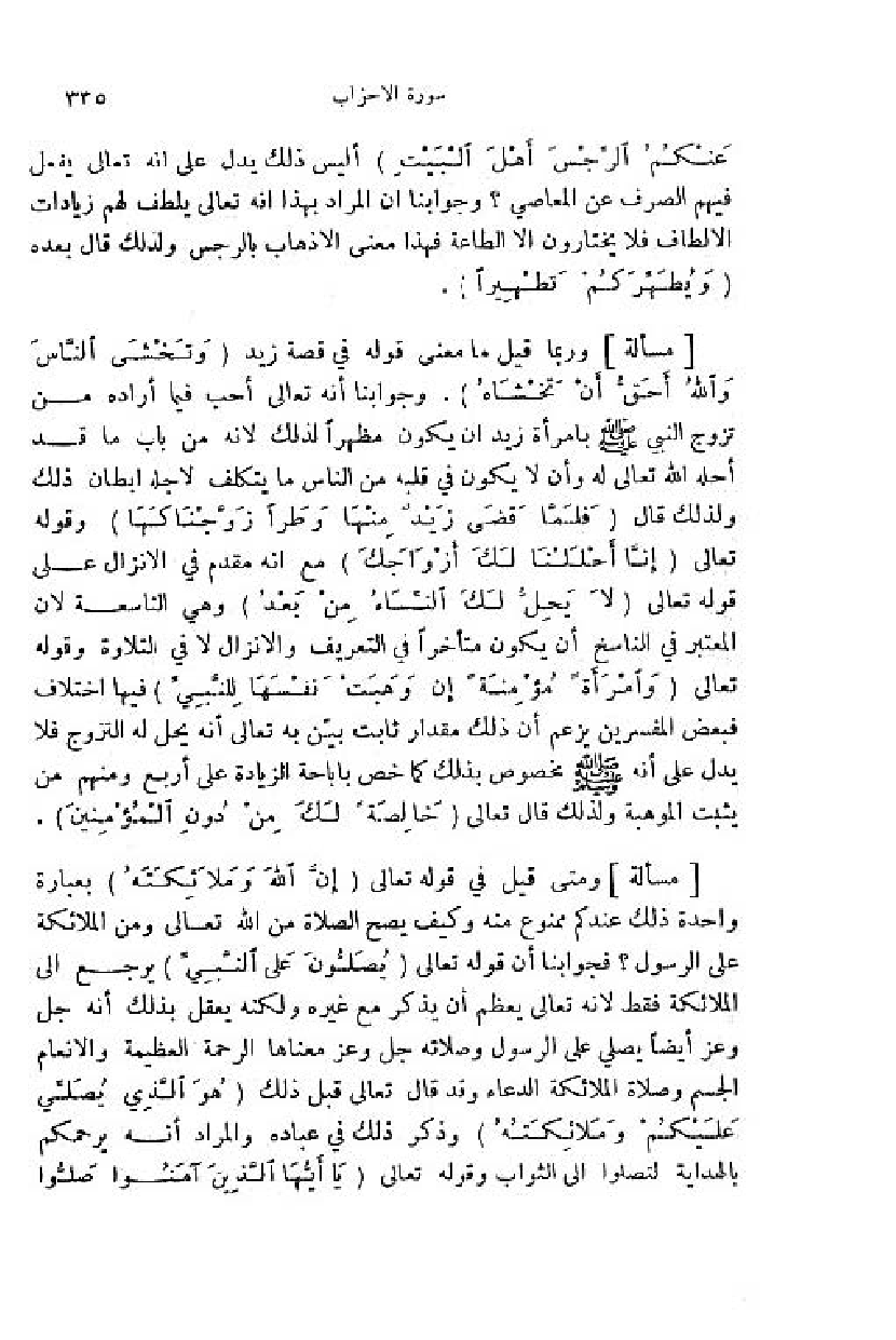 وربما قيل ما معنى قوله في قصة زيد (وَ تَخْشَى النَّاسَ واللَّهُ أَحَقُّ أَنْ تَخْشاهُ). وجوابنا أنه تعالى أحب فيما أراده من تزوج النبي صلّى اللّه عليه وسلم بامرأة زيد ان يكون مظهرا لذلك لانه من باب ما قد أحله اللّه تعالى له وأن لا يكون في قلبه من الناس ما يتكلف لاجله ابطان ذلك ولذلك قال (فَلَمَّا قَضى زَيْدٌ مِنْها وَطَراً زَوَّجْناكَها) وقوله تعالى (إِنَّا أَحْلَلْنا لَكَ أَزْواجَكَ) مع انه مقدم في الانزال على قوله تعالى (لا يَحِلُّ لَكَ النِّساءُ مِنْ بَعْدُ) وهي التاسعة لان المعتبر في الناسخ أن يكون متأخرا في التعريف والانزال لا في التلاوة وقوله تعالى (وَ امْرَأَةً مُؤْمِنَةً إِنْ وَهَبَتْ نَفْسَها لِلنَّبِيِّ) فيها اختلاف فبعض المفسرين يزعم أن ذلك مقدار ثابت بيّن به تعالى أنه يحل له التزوج فلا يدل على أنه صلّى اللّه عليه وسلم مخصوص بذلك كما خص باباحة الزيادة على أربع ومنهم من يثبت الموهبة ولذلك قال تعالى (خالِصَةً لَكَ مِنْ دُونِ الْمُؤْمِنِينَ).