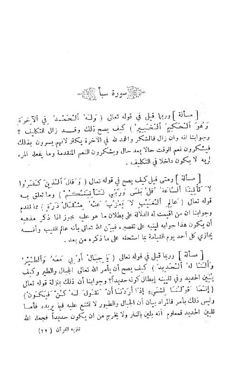 وربما قيل في قوله تعالى (يا جِبالُ أَوِّبِي مَعَهُ والطَّيْرَ وأَلَنَّا لَهُ الْحَدِيدَ) كيف يصح أن يأمر اللّه تعالى الجبال والطير وكيف يلين الحديد وفي تليينه إبطال كونه حديدا؟ وجوابنا أن ذلك بمنزلة قوله تعالى (إِنَّما قَوْلُنا لِشَيْءٍ إِذا أَرَدْناهُ أَنْ نَقُولَ لَهُ كُنْ فَيَكُونُ) وليس ذلك بأمر فالمراد بيان أن الجبال والطيور لا تمتنع عليه فيما يريده فأما تليين الحديد فمعلوم أنه يلين بالنار ولا يخرج من ان يكون حديدا فجعله اللّه تنزيه القرآن (22)