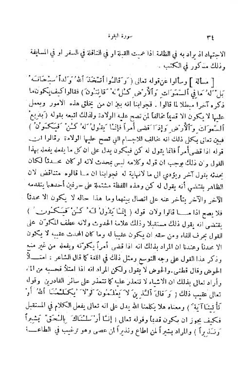 وسألوا عن قوله تعالى (وَ قالُوا اتَّخَذَ اللَّهُ وَلَداً سُبْحانَهُ بَلْ لَهُ ما فِي السَّماواتِ والْأَرْضِ كُلٌّ لَهُ قانِتُونَ) فقالوا كيف يكون ما ذكره آخرا مبطلا لما قالوا. فجوابنا انه بين ان من يخلق هذه الامور ويعمل عليها لا يكون الا قديما مخالفا لمن تصح عليه الولادة ولذلك اتبعه بقوله (بَدِيعُ السَّماواتِ والْأَرْضِ وإِذا قَضى أَمْراً فَإِنَّما يَقُولُ لَهُ كُنْ فَيَكُونُ) فبين تعالى بكل ذلك انه مخالف للاجسام التي تصح عليها الولادة وقالوا ان قوله اذا قضى أمرا فانما يقول له كن فيكون يدل على ان كل ما يفعله يفعله بهذا القول وان ذلك يوجب ان قوله وكلامه ليس بمحدث لانه لو كان محدثا لكان يحدثه بقول آخر ويؤدي الى ما لا نهاية له فجوابنا ان ما قالوه متناقض لان الظاهر يقتضي أنه يقول له كن وهذه اللفظة مشتملة على حرفين أحدهما يتقدمه الآخر والآخر يتأخر عنه على اتصال بينهما وما هذا حاله لا يكون الا محدثا فلا يصح اذا ما قالوا ولان قوله (فَإِنَّما يَقُولُ لَهُ كُنْ فَيَكُونُ) يقتضى انه يقول ذلك مستقبلا وذلك علامة الحدوث ولانه عطف المكوّن على القول بحرف الفاء ومن حقه ان يكون عقيبا له وما كان المحدث عقيبه لا يكون الا محدثا وعندنا ان المراد بذلك انه اذا قضى أمرا يكوّنه ويفعله من غير منع وذكر هذا القول على وجه التوسع ومثل ذلك في اللغة كما قال الشاعر: امتلأ الحوض وقال قطنى. والحوض لا يقول ولكن المراد انه اذا امتلأ فحسبه من الماء وأراد تعالى بذلك ان الاشياء لا تتعذر عليه كما تتعذر على سائر القادرين وقوله تعالى عقيب ذلك (وَ قالَ الَّذِينَ لا يَعْلَمُونَ لَوْ لا يُكَلِّمُنَا اللَّهُ أَوْ تَأْتِينا آيَةٌ) ومعناه هلا يكلمنا اللّه يدل على انه تعالى يفعل الكلام في المستقبل فكيف يجوز ان يكون قديما وقوله تعالى (إِنَّا أَرْسَلْناكَ بِالْحَقِّ بَشِيراً ونَذِيراً) والمراد بشيرا لمن اطاع ونذيرا لمن عصى وهو ترغيب في الطاعة