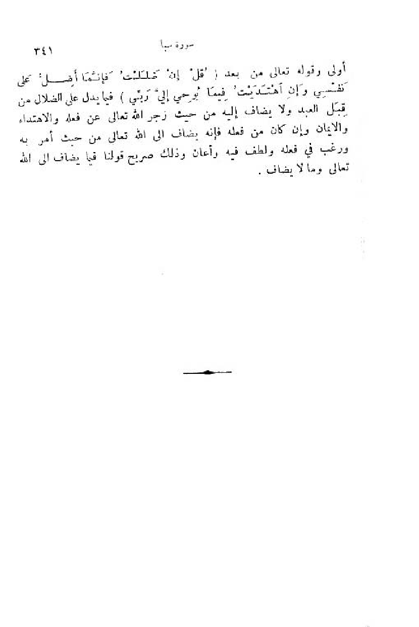 أولى وقوله تعالى من بعد (قُلْ إِنْ ضَلَلْتُ فَإِنَّما أَضِلُّ عَلى نَفْسِي وإِنِ اهْتَدَيْتُ فَبِما يُوحِي إِلَيَّ رَبِّي) فيما يدل على الضلال من قبل العبد ولا يضاف إليه من حيث زجر اللّه تعالى عن فعله والاهتداء والايمان وإن كان من فعله فإنه يضاف الى اللّه تعالى من حيث أمر به ورغب في فعله ولطف فيه وأعان وذلك صريح قولنا فيما يضاف الى اللّه تعالى وما لا يضاف.