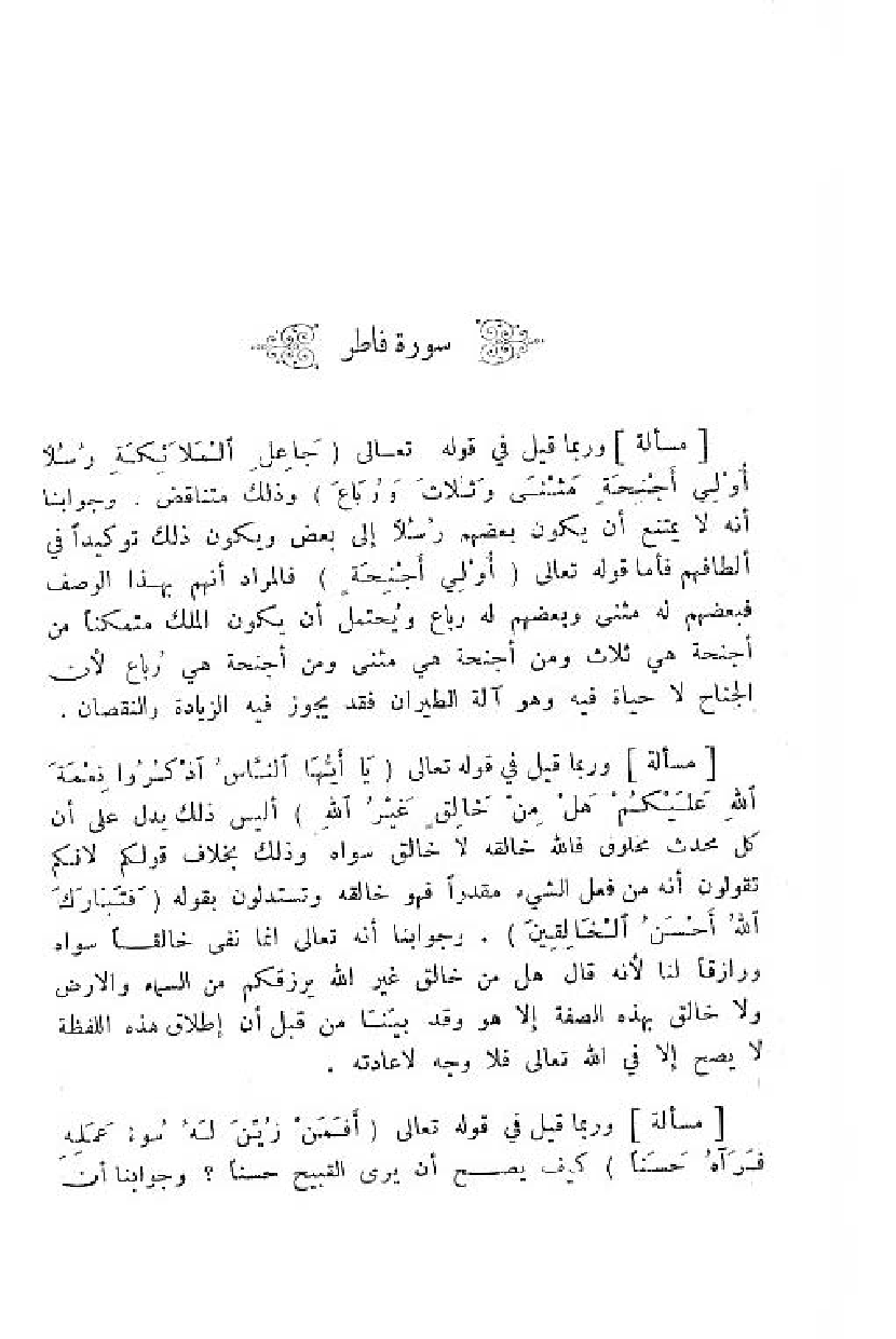 وربما قيل في قوله تعالى (جاعِلِ الْمَلائِكَةِ رُسُلًا أُولِي أَجْنِحَةٍ مَثْنى وثُلاثَ ورُباعَ) وذلك متناقض. وجوابنا أنه لا يمتنع أن يكون بعضهم رسلا إلى بعض ويكون ذلك توكيدا في ألطافهم فأما قوله تعالى (أُولِي أَجْنِحَةٍ) فالمراد أنهم بهذا الوصف فبعضهم له مثنى وبعضهم له رباع ويحتمل أن يكون الملك متمكنا من أجنحة هي ثلاث ومن أجنحة هي مثنى ومن أجنحة هي رباع لأن الجناح لا حياة فيه وهو آلة الطيران فقد يجوز فيه الزيادة والنقصان.