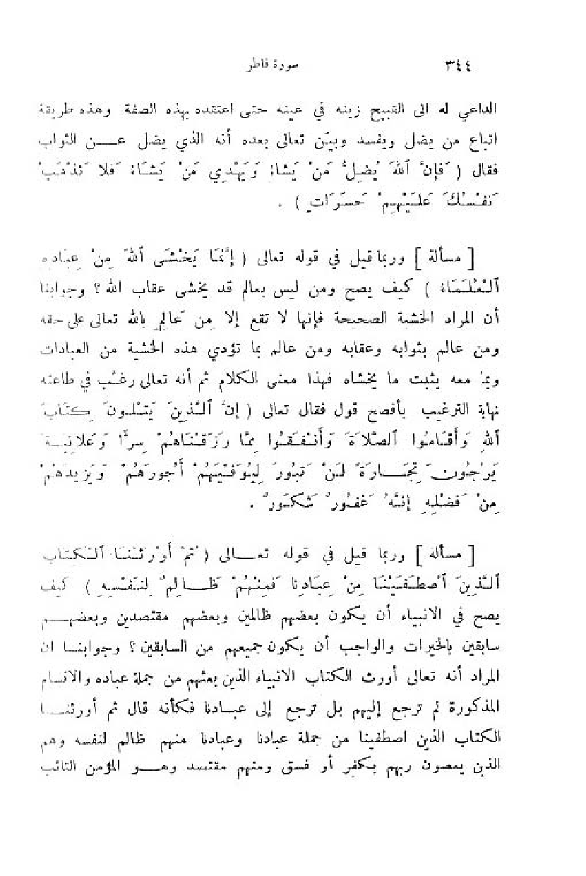 وربما قيل في قوله تعالى (إِنَّما يَخْشَى اللَّهَ مِنْ عِبادِهِ الْعُلَماءُ) كيف يصح ومن ليس بعالم قد يخشى عقاب اللّه؟ وجوابنا أن المراد الخشية الصحيحة فإنها لا تقع إلا من عالم باللّه تعالى على حقه ومن عالم بثوابه وعقابه ومن عالم بما تؤدي هذه الخشية من العبادات وبما معه يثبت ما يخشاه فهذا معنى الكلام ثمّ أنه تعالى رغّب في طاعته نهاية الترغيب بأفصح قول فقال تعالى (إِنَّ الَّذِينَ يَتْلُونَ كِتابَ اللَّهِ وأَقامُوا الصَّلاةَ وأَنْفَقُوا مِمَّا رَزَقْناهُمْ سِرًّا وعَلانِيَةً يَرْجُونَ تِجارَةً لَنْ تَبُورَ لِيُوَفِّيَهُمْ أُجُورَهُمْ ويَزِيدَهُمْ مِنْ فَضْلِهِ إِنَّهُ غَفُورٌ شَكُورٌ.)