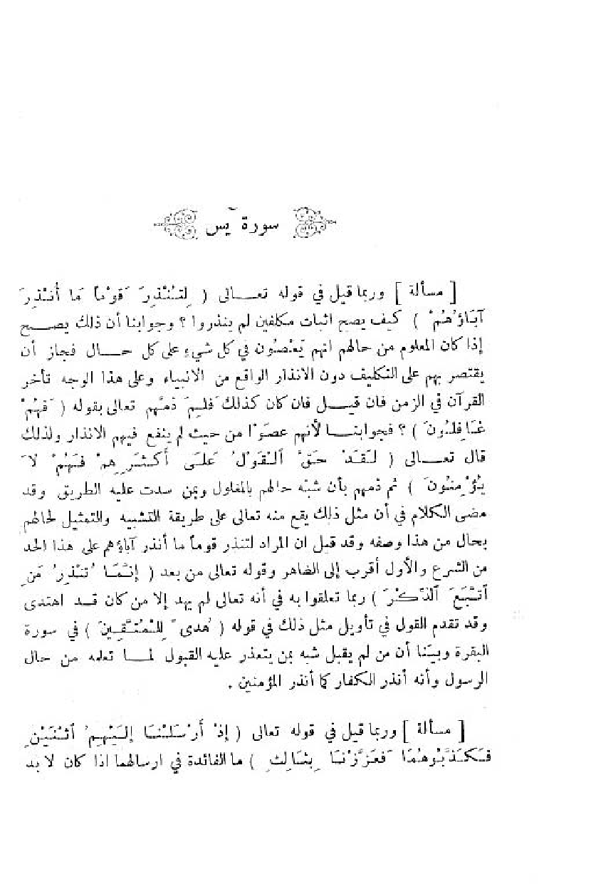 وربما قيل في قوله تعالى (لِتُنْذِرَ قَوْماً ما أُنْذِرَ آباؤُهُمْ) كيف يصح اثبات مكلفين لم ينذروا؟ وجوابنا أن ذلك يصح إذا كان المعلوم من حالهم انهم يعصون في كل شيء على كل حال فجاز أن يقتصر بهم على التكليف دون الانذار الواقع من الانبياء وعلى هذا الوجه تأخر القرآن في الزمن فان قيل فان كان كذلك فلم ذمّهم تعالى بقوله (فَهُمْ غافِلُونَ)؟ فجوابنا لأنهم عصوا من حيث لم ينفع فيهم الانذار ولذلك قال تعالى (لَقَدْ حَقَّ الْقَوْلُ عَلى أَكْثَرِهِمْ فَهُمْ لا يُؤْمِنُونَ) ثمّ ذمهم بأن شبّه حالهم بالمغلول وبمن سدت عليه الطريق وقد مضى الكلام في أن مثل ذلك يقع منه تعالى على طريقة التشبيه والتمثيل لحالهم بحال من هذا وصفه وقد قيل ان المراد لتنذر قوما ما أنذر آباؤهم على هذا الحد من الشرع والأول أقرب إلى الظاهر وقوله تعالى من بعد (إِنَّما تُنْذِرُ مَنِ اتَّبَعَ الذِّكْرَ) ربما تعلقوا به في أنه تعالى لم يهد إلا من كان قد اهتدى وقد تقدم القول في تأويل مثل ذلك في قوله (هُدىً لِلْمُتَّقِينَ) في سورة البقرة وبيّنا أن من لم يقبل شبه بمن يتعذر عليه القبول لما تعلمه من حال الرسول وأنه أنذر الكفار كما أنذر المؤمنين.