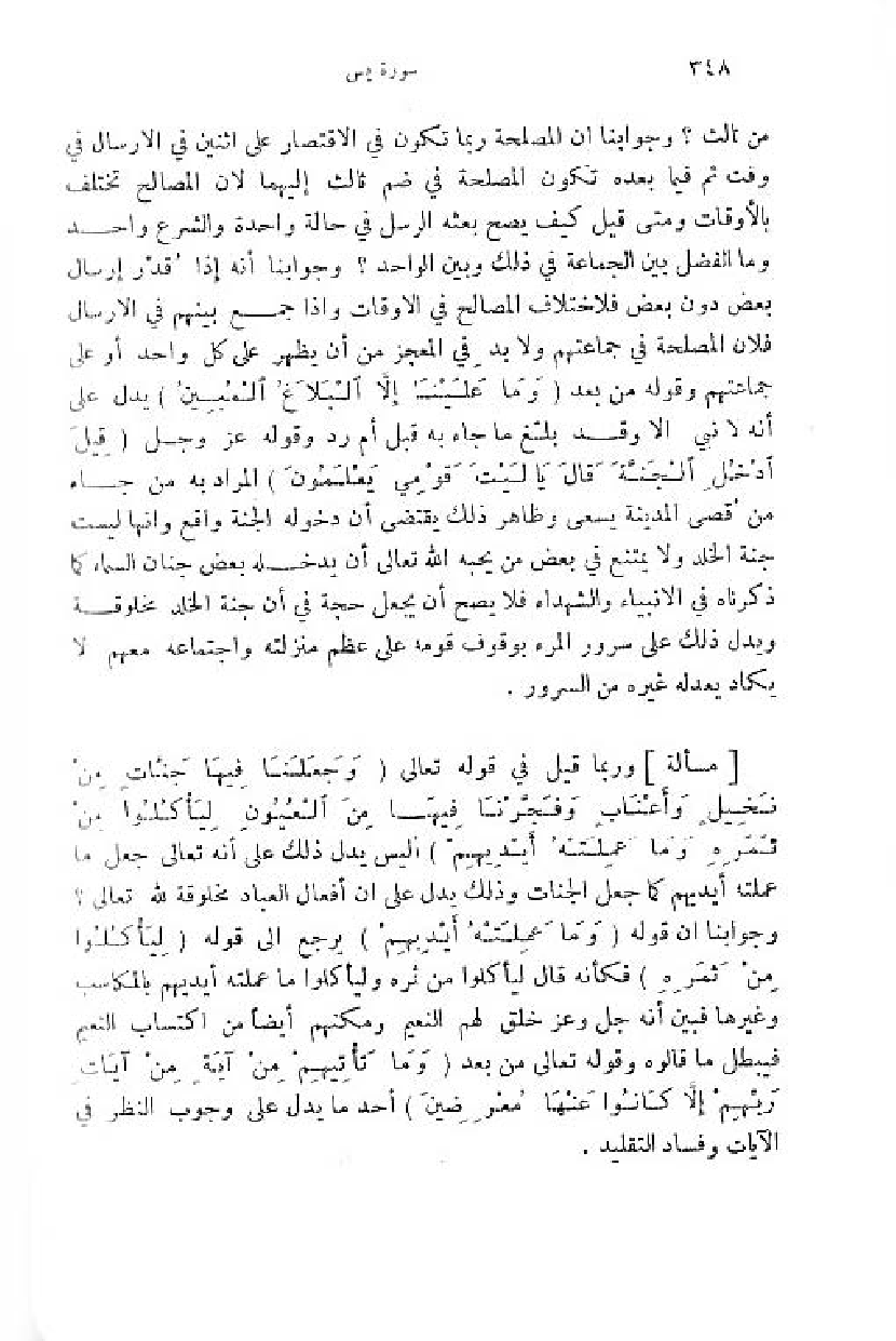 من ثالث؟ وجوابنا ان المصلحة ربما تكون في الاقتصار على اثنين في الارسال في وقت ثمّ فيما بعده تكون المصلحة في ضم ثالث إليهما لان المصالح تختلف بالأوقات ومتى قيل كيف يصح بعثه الرسل في حالة واحدة والشرع واحد وما الفضل بين الجماعة في ذلك وبين الواحد؟ وجوابنا أنه إذا قدّر إرسال بعض دون بعض فلاختلاف المصالح في الاوقات واذا جمع بينهم في الارسال فلان المصلحة في جماعتهم ولا بد في المعجز من أن يظهر على كل واحد أو على جماعتهم وقوله من بعد (وَ ما عَلَيْنا إِلَّا الْبَلاغُ الْمُبِينُ) يدل على أنه لا نبي الا وقد بلّغ ما جاء به قبل أم رد وقوله عز وجل (قِيلَ ادْخُلِ الْجَنَّةَ قالَ يا لَيْتَ قَوْمِي يَعْلَمُونَ) المراد به من جاء من أقصى المدينة يسعى وظاهر ذلك يقتضى أن دخوله الجنة واقع وانها ليست جنة الخلد ولا يمتنع في بعض من يحبه اللّه تعالى أن يدخله بعض جنان السماء كما ذكرناه في الانبياء والشهداء فلا يصح أن يجعل حجة في أن جنة الخلد مخلوقة ويدل ذلك على سرور المرء بوقوف قومه على عظم منزلته واجتماعه معهم لا يكاد يعدله غيره من السرور.