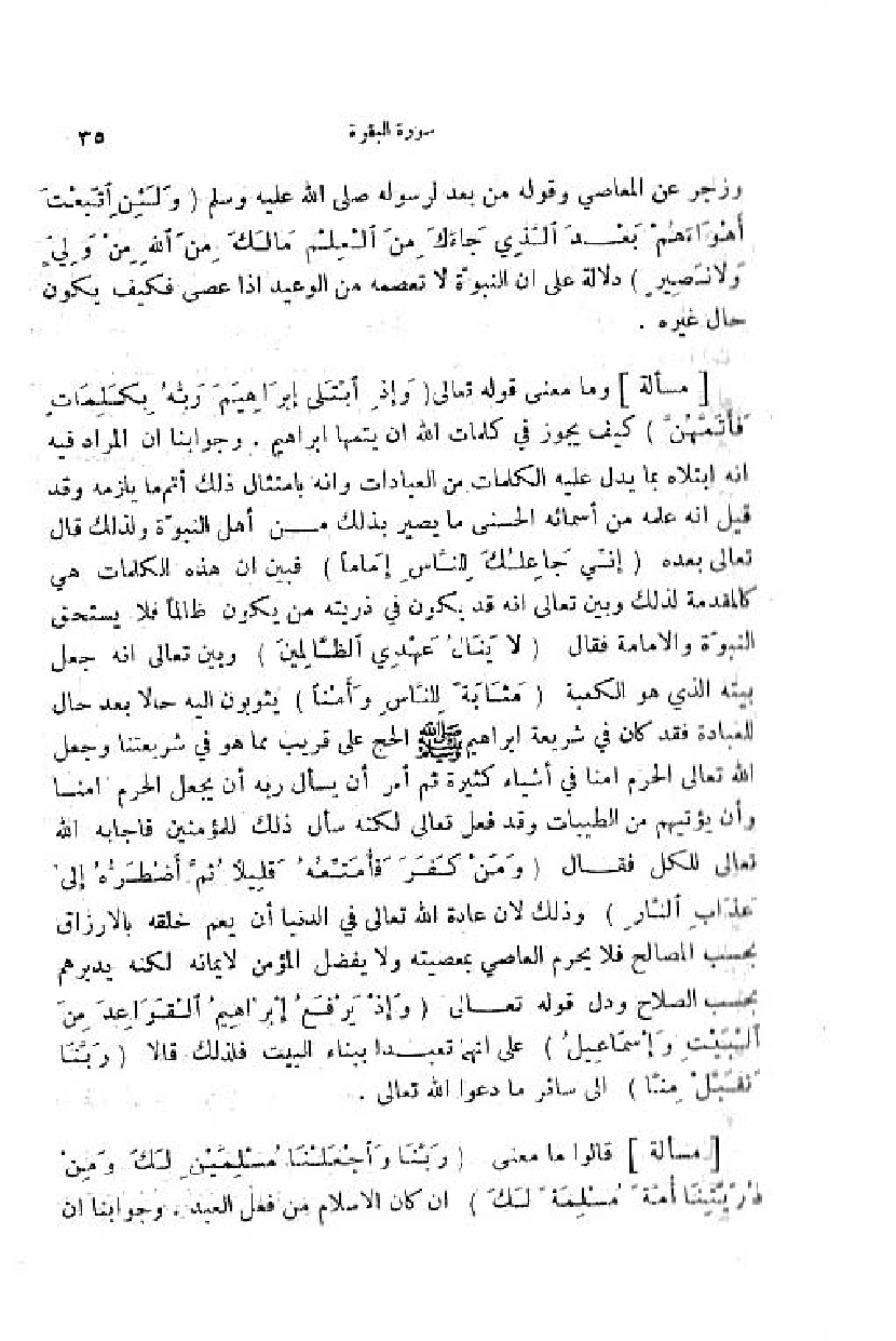 وما معنى قوله تعالى (وَ إِذِ ابْتَلى إِبْراهِيمَ رَبُّهُ بِكَلِماتٍ فَأَتَمَّهُنَّ) كيف يجوز في كلمات اللّه ان يتمها ابراهيم. وجوابنا ان المراد فيه انه ابتلاه بما يدل عليه الكلمات من العبادات وانه بامتثال ذلك أتم ما يلزمه وقد قيل انه علمه من أسمائه الحسنى ما يصير بذلك من أهل النبوّة ولذلك قال تعالى بعده (إِنِّي جاعِلُكَ لِلنَّاسِ إِماماً) فبين ان هذه الكلمات هي كالمقدمة لذلك وبين تعالى انه قد يكون في ذريته من يكون ظالما فلا يستحق النبوّة والامامة فقال (لا يَنالُ عَهْدِي الظَّالِمِينَ) وبين تعالى انه جعل بيته الذي هو الكعبة (مَثابَةً لِلنَّاسِ وأَمْناً) يثوبون اليه حالا بعد حال للعبادة فقد كان في شريعة ابراهيم صلّى اللّه عليه وسلم الحج على قريب مما هو في شريعتنا وجعل اللّه تعالى الحرم آمنا في أشياء كثيرة ثمّ أمر أن يسأل ربه أن يجعل الحرم آمنا وأن يؤتيهم من الطيبات وقد فعل تعالى لكنه سأل ذلك للمؤمنين فاجابه اللّه تعالى للكل فقال (وَ مَنْ كَفَرَ فَأُمَتِّعُهُ قَلِيلًا ثُمَّ أَضْطَرُّهُ إِلى عَذابِ النَّارِ) وذلك لان عادة اللّه تعالى في الدنيا أن يعم خلقه بالارزاق بحسب المصالح فلا يحرم العاصي بمعصيته ولا يفضل المؤمن لإيمانه لكنه يدبرهم بحسب الصلاح ودل قوله تعالى (وَ إِذْ يَرْفَعُ إِبْراهِيمُ الْقَواعِدَ مِنَ الْبَيْتِ وإِسْماعِيلُ) على انهما تعبدا ببناء البيت فلذلك قالا (رَبَّنا تَقَبَّلْ مِنَّا) الى سائر ما دعوا اللّه تعالى.