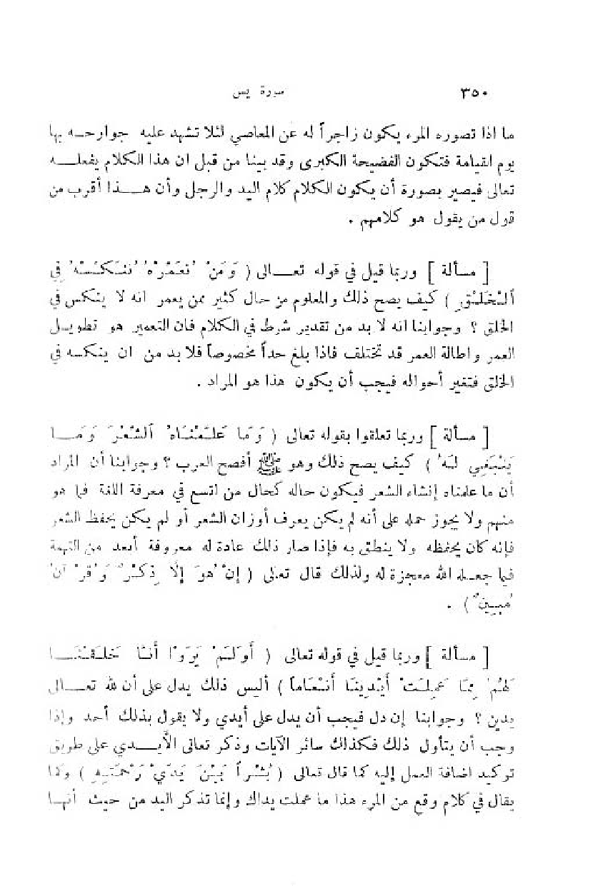 وربما قيل في قوله تعالى (أَ ولَمْ يَرَوْا أَنَّا خَلَقْنا لَهُمْ مِمَّا عَمِلَتْ أَيْدِينا أَنْعاماً) أ ليس ذلك يدل على أن للّه تعالى يدين؟ وجوابنا إن دل فيجب أن يدل على أيدي ولا يقول بذلك أحد وإذا وجب أن يتأول ذلك فكذلك سائر الآيات وذكر تعالى الأيدي على طريق توكيد اضافة العمل إليه كما قال تعالى (بُشْراً بَيْنَ يَدَيْ رَحْمَتِهِ) وكما يقال في كلام وقع من المرء هذا ما عملت يداك وإنما تذكر اليد من حيث أنها