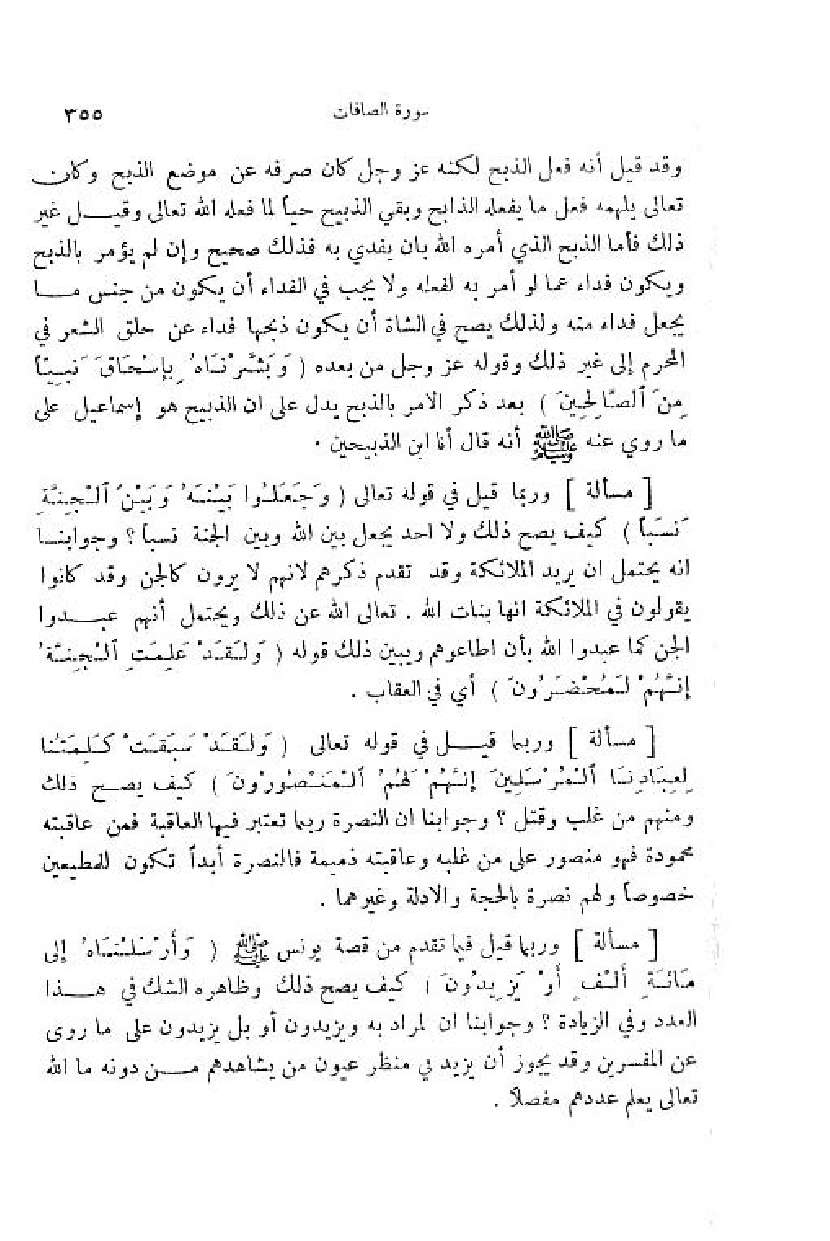 وربما قيل في قوله تعالى (وَ جَعَلُوا بَيْنَهُ وبَيْنَ الْجِنَّةِ نَسَباً) كيف يصح ذلك ولا احد يجعل بين اللّه وبين الجنة نسبا؟ وجوابنا انه يحتمل ان يريد الملائكة وقد تقدم ذكرهم لانهم لا يرون كالجن وقد كانوا يقولون في الملائكة انها بنات اللّه. تعالى اللّه عن ذلك ويحتمل أنهم عبدوا الجن كما عبدوا اللّه بأن اطاعوهم ويبين ذلك قوله (وَ لَقَدْ عَلِمَتِ الْجِنَّةُ إِنَّهُمْ لَمُحْضَرُونَ) أي في العقاب.