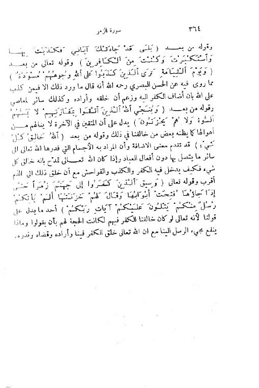 وقوله من بعد (بَلى قَدْ جاءَتْكَ آياتِي فَكَذَّبْتَ بِها واسْتَكْبَرْتَ وكُنْتَ مِنَ الْكافِرِينَ) وقوله تعالى من بعد (وَ يَوْمَ الْقِيامَةِ تَرَى الَّذِينَ كَذَبُوا عَلَى اللَّهِ وُجُوهُهُمْ مُسْوَدَّةٌ) مما روى فيه عن الحسن البصري رحمه اللّه أنه قال ما ورد ذلك الا فيمن كذب على اللّه بان أضاف الكفر اليه وزعم أن خلقه وأراده وكذلك سائر المعاصي وقوله من بعد (وَ يُنَجِّي اللَّهُ الَّذِينَ اتَّقَوْا بِمَفازَتِهِمْ لا يَمَسُّهُمُ السُّوءُ ولا هُمْ يَحْزَنُونَ) يدل على أن المتقين في الآخرة لا ينالهم من أهوالها كما يظنه بعض من خالفنا في ذلك وقوله من بعد (اللَّهُ خالِقُ كُلِّ شَيْءٍ) قد تقدم معنى الاضافة وأن المراد به الأجسام التي قدرها اللّه تعالى الى سائر ما يتصل بها دون أفعال العباد وإذا كان اللّه تعالى تمدّح بانه خالق كل شيء فكيف يدخل فيه الكفر والكذب والفواحش مع أن خلق ذلك الى الذم أقرب وقوله تعالى (وَ سِيقَ الَّذِينَ كَفَرُوا إِلى جَهَنَّمَ زُمَراً حَتَّى إِذا جاؤُها فُتِحَتْ أَبْوابُها وقالَ لَهُمْ خَزَنَتُها أَ لَمْ يَأْتِكُمْ رُسُلٌ مِنْكُمْ يَتْلُونَ عَلَيْكُمْ آياتِ رَبِّكُمْ) أحد ما يدل على قولنا لأنه تعالى لو كان خالقنا للكفر فيهم لكانت الحجة لهم بأن يقولوا وما ذا ينفع مجيء الرسل الينا مع ان اللّه تعالى خلق الكفر فينا وأراده وقضاه وقدره.